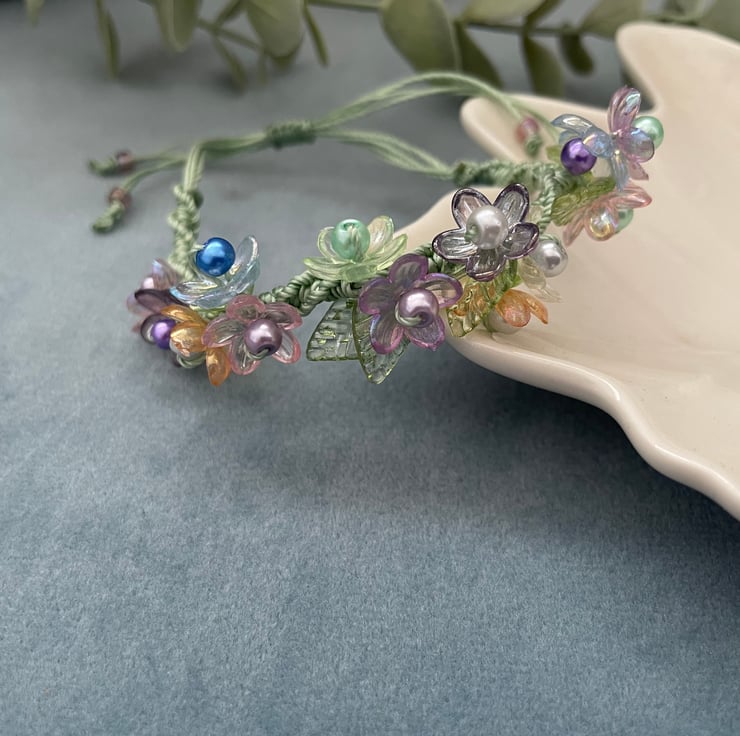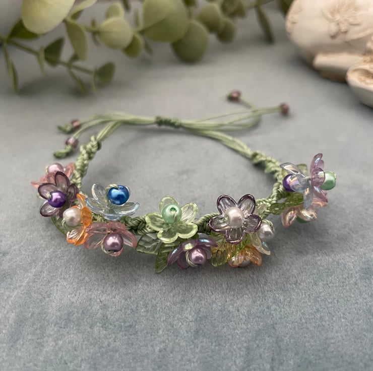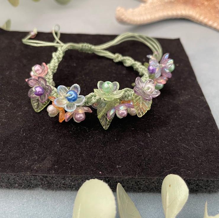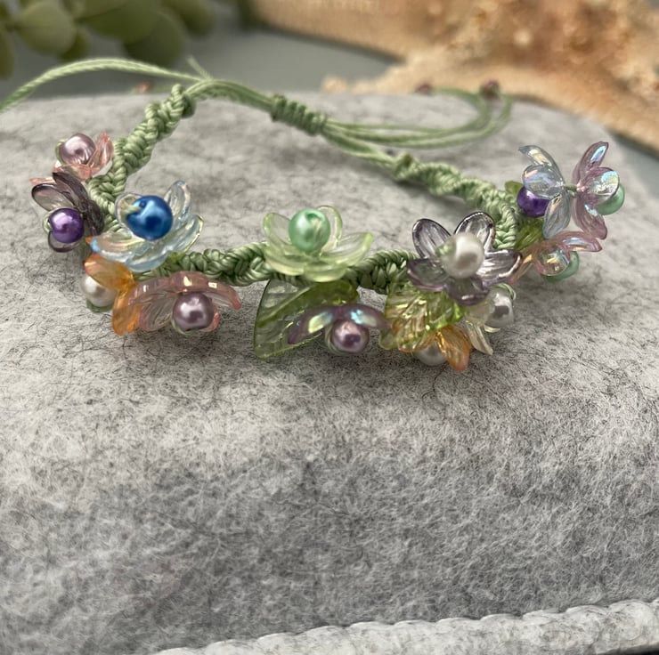 A lovely selection of lucite flower beads and glass beads come together to create this pretty adjustable bracelet . Linked together using very strong C Lon macrame thread in a twisted knot design .