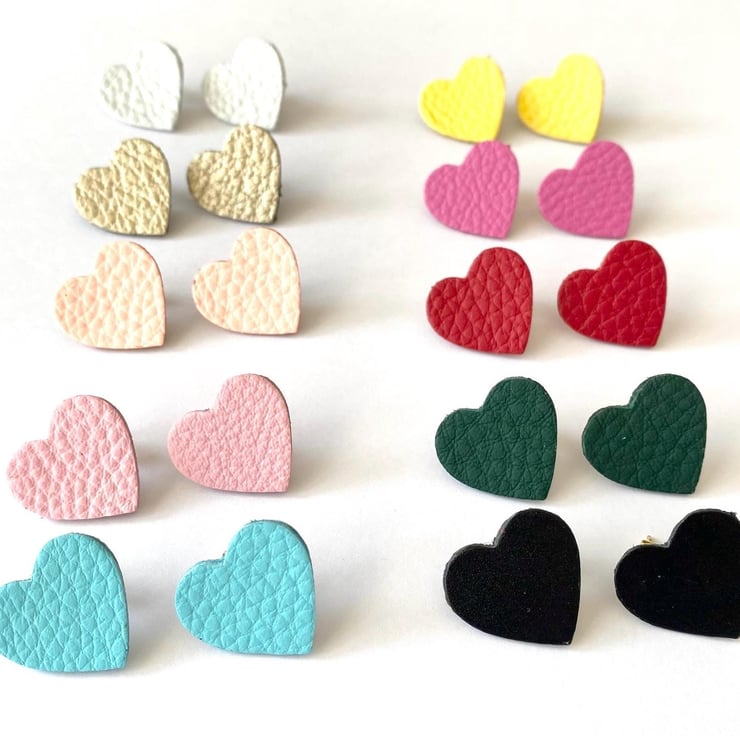 Light pink coloured high quality leather hearts on gold plated studs. The studs are set slightly to one side so they hang in a modern way (see model photo). Available in many other colours (see dropdown and other listings).
