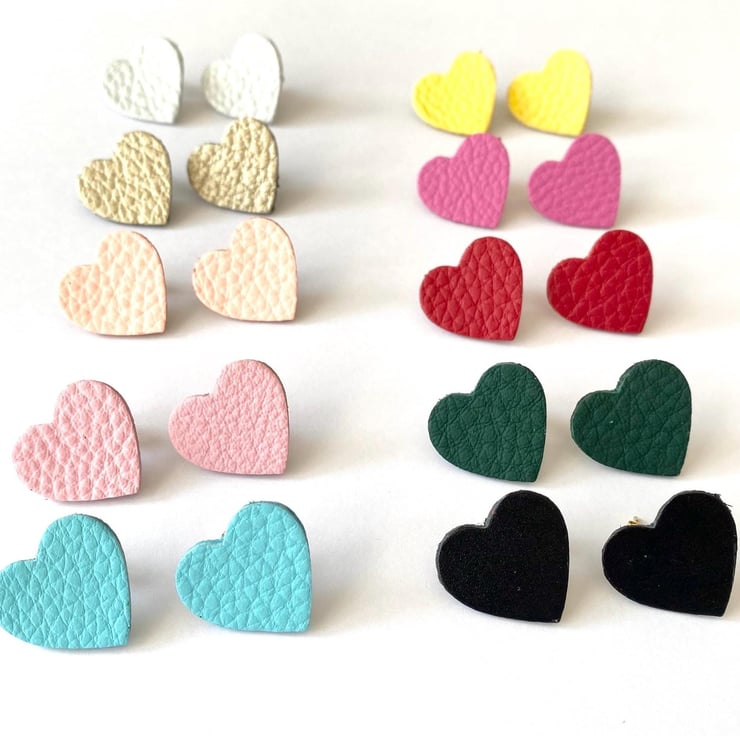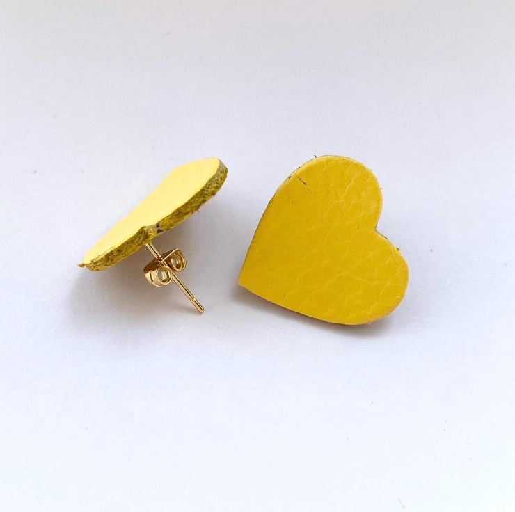 Yellow coloured high quality leather hearts on gold plated studs. The studs are set slightly to one side so they hang in a modern way (see model photo). Available in many other colours (see dropdown and other listings).