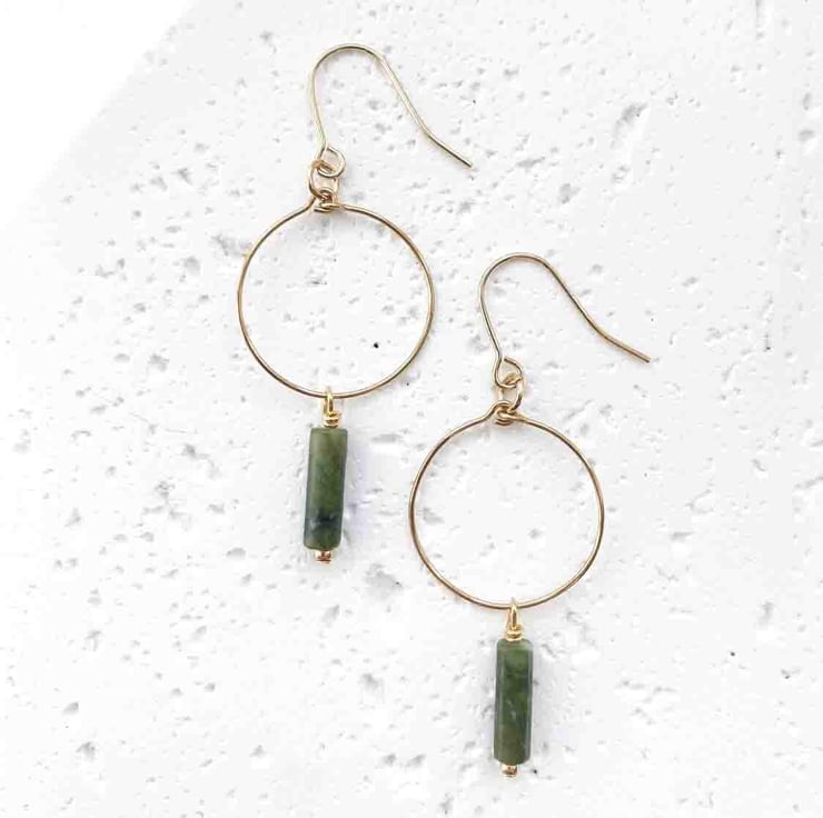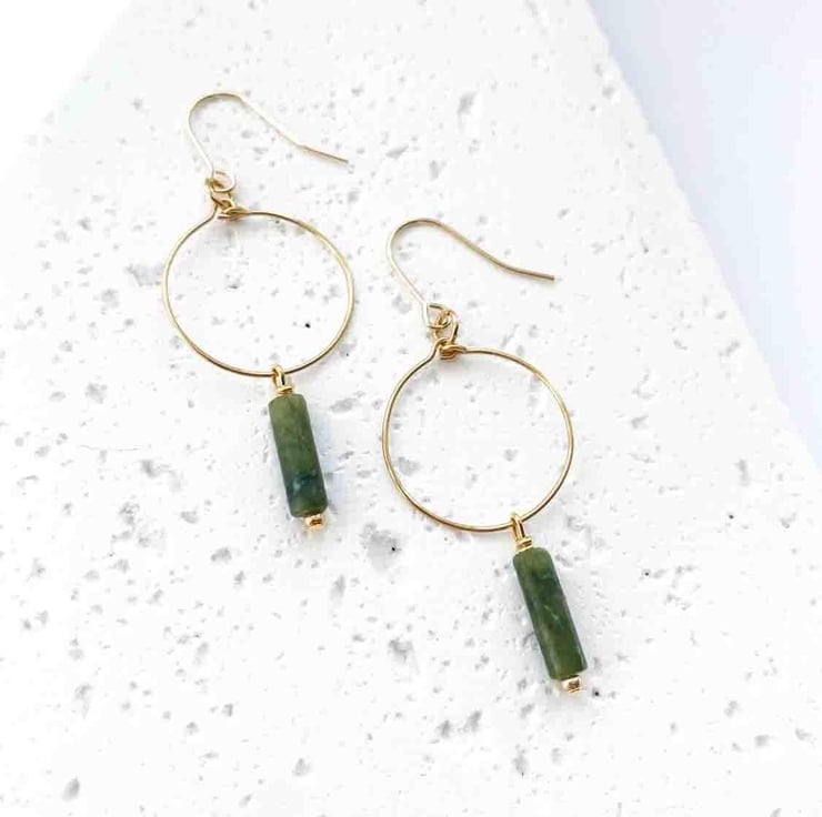 Drop hoop earrings made with natural Jade stones and Miyuki seed beads - Available with Sterling Silver or Gold-Plated Ear Wires (shown).