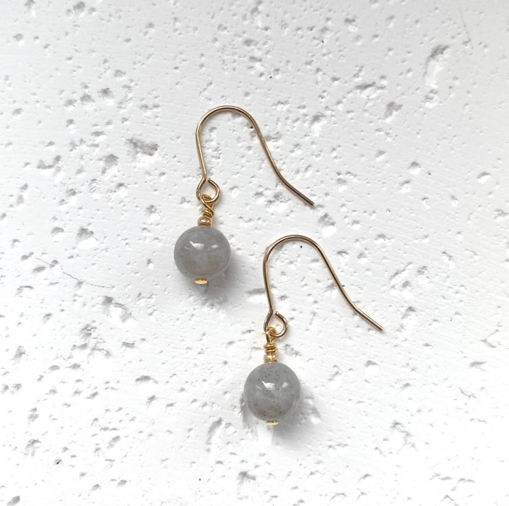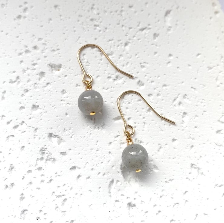 Dainty drop earrings made with an 8mm round Labradorite stone and Miyuki seed beads - Available with Sterling Silver or Gold-Plated Ear Wires (shown).