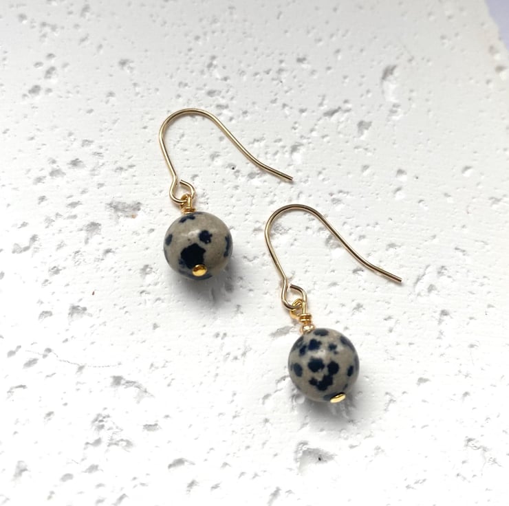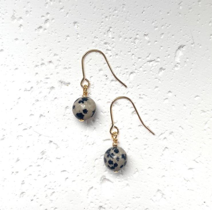 Dainty drop earrings made with an 8mm round Dalmation Jasper stones and Miyuki seed beads - Available with Sterling Silver or Gold-Plated Ear Wires (shown).