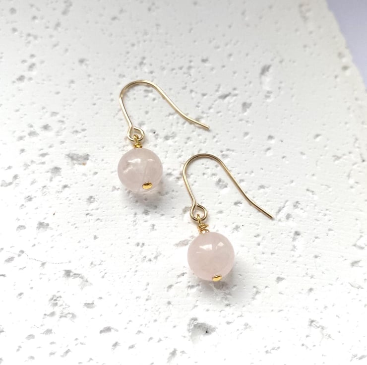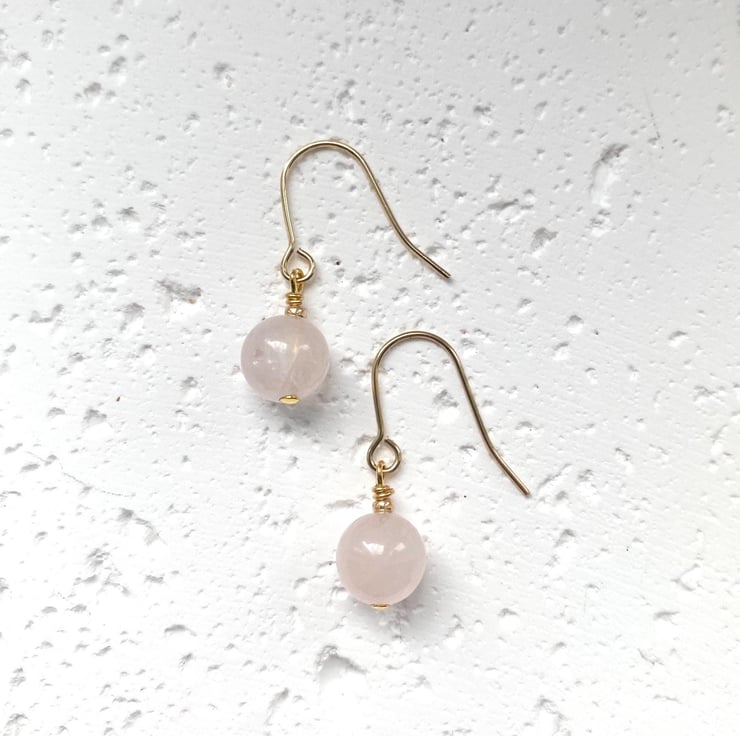 Dainty drop earrings made with an 8mm round Rose Quartz stone and Miyuki seed beads - Available with Sterling Silver or Gold-Plated Ear Wires (shown).