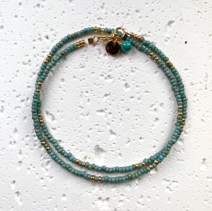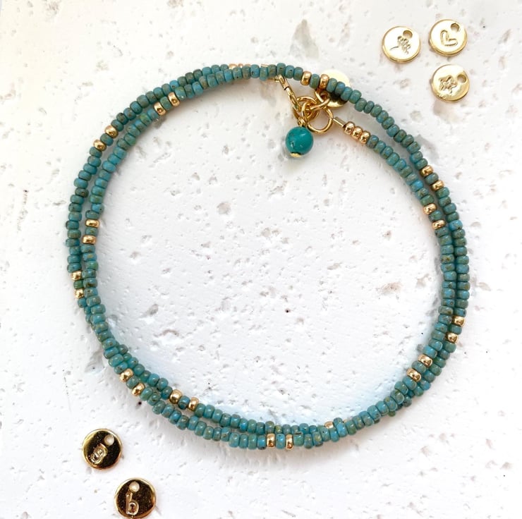 Wraparound Miyuki Seed Bead bracelet made with opaque turquoise and gold beads and finished with an Amazonite bead and personalised gold plated disc - Available with Sterling Silver or Gold-Plated Ear Wires (shown).