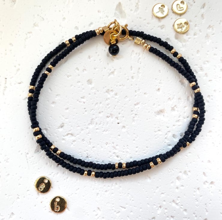 Wraparound Miyuki Seed Bead bracelet made with matt black and gold beads, finished with a single Black Onyx bead and personalised gold plated disc on the extension chain - Available with a gold plated or sterling silver clasp.