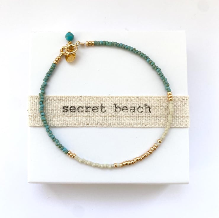 Minimalist, Miyuki seed bead bracelet in opaque light seafoam, opaque taupe and opaque gold, finished with a 4mm Turquoise and a personalised extension chain stamped with your choice of letter, number or symbols (limited).