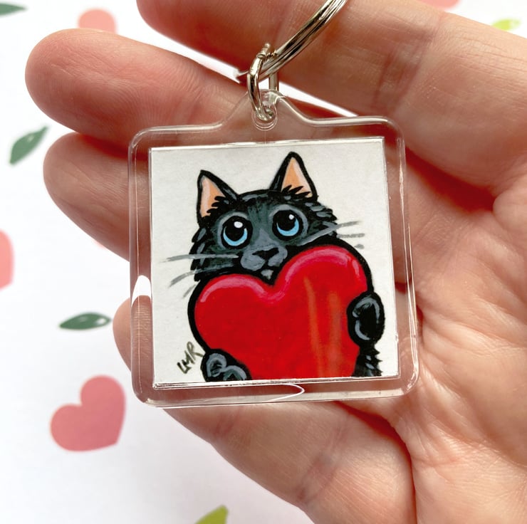 Show off your love for cats and Valentine's Day with this adorable black cat keyring! Crafted from square acrylic housing a mini print, this cute keyring features a black kitty holding a big red heart, making it the perfect treat for cat lovers or a sweet gift for someone special.