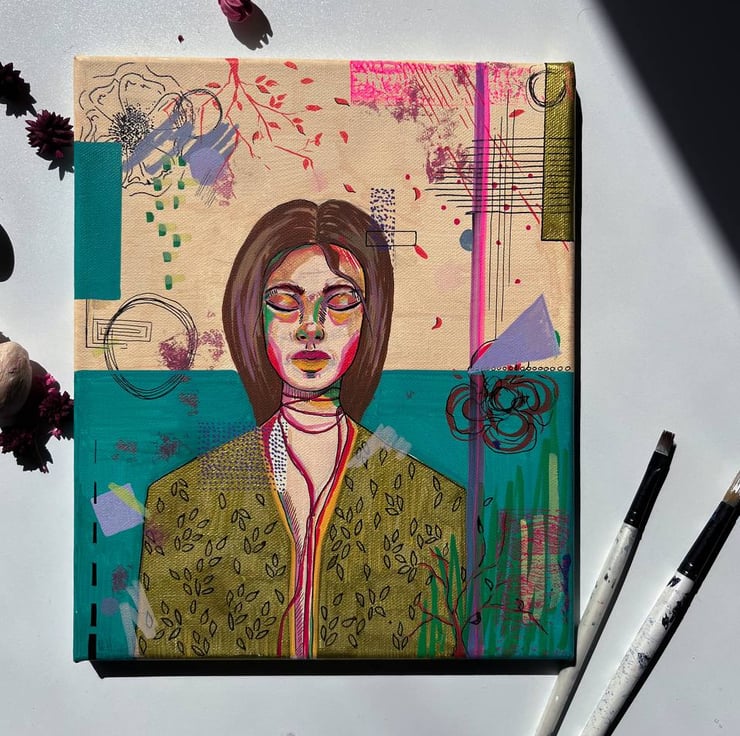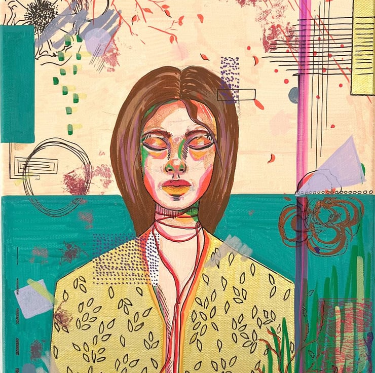 Inner Bloom explores the quiet resilience of the human spirit through a layered portrait that merges abstraction with symbolism. The closed eyes of the central figure suggest introspection and inner calm, while the surrounding marks, textures, and botanical motifs reflect a complex emotional landscape. Using a mix of acrylic, ink, collage, and linear elements, the piece balances control and spontaneity, structure and vulnerability.