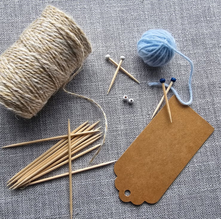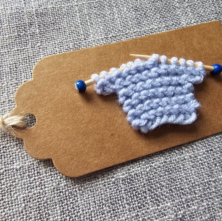 I knit the tiny jumpers myself and transfer them on to my tiny hand-made needles. They then get stuck onto a brown kraft label and are finished with some twine.