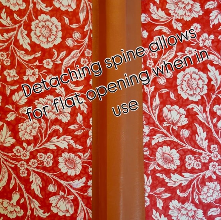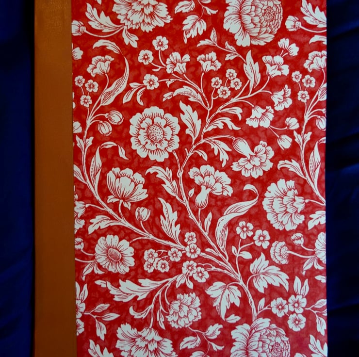 Handmade cover featuring German paper in a red and white floral pattern, and light brown faux leather