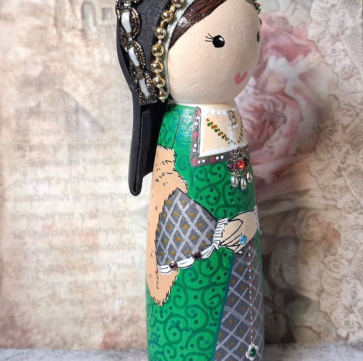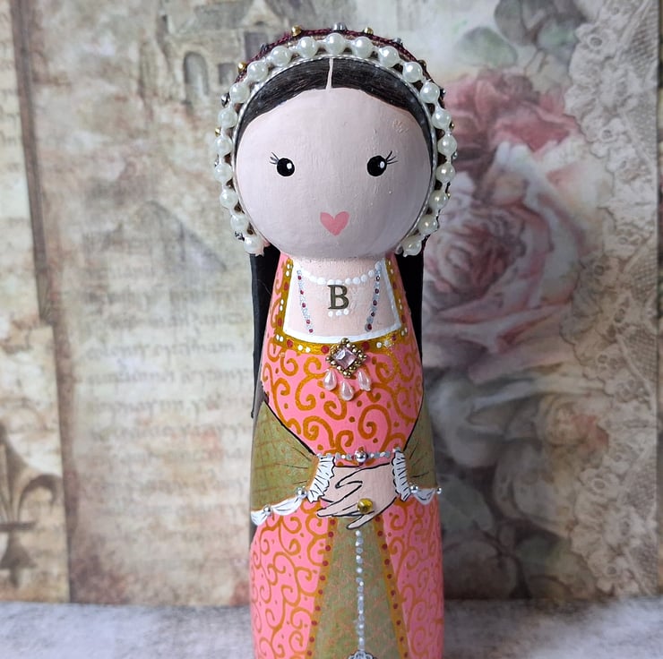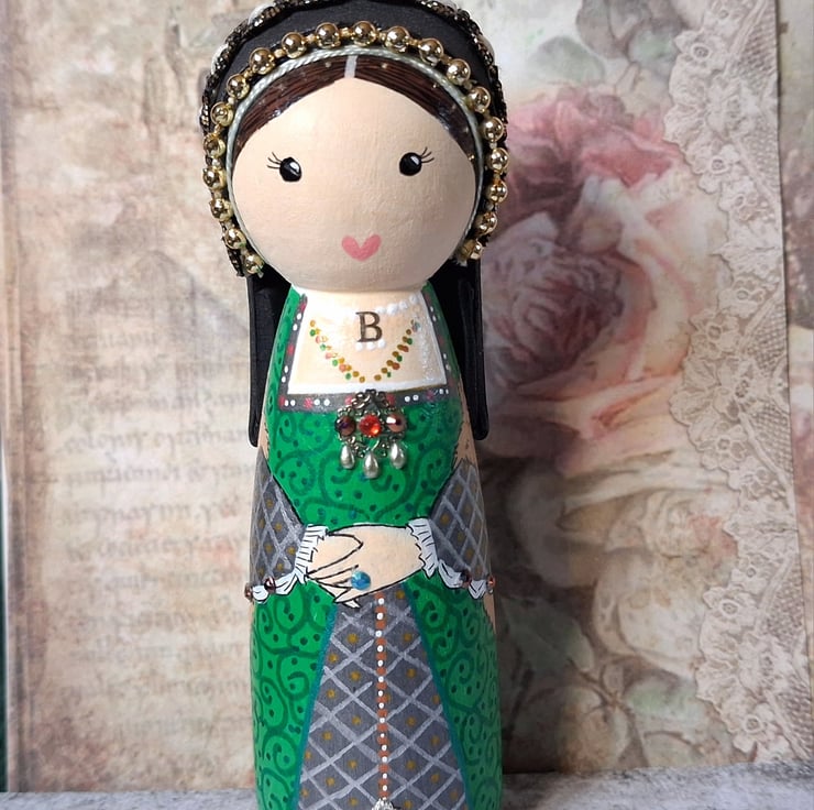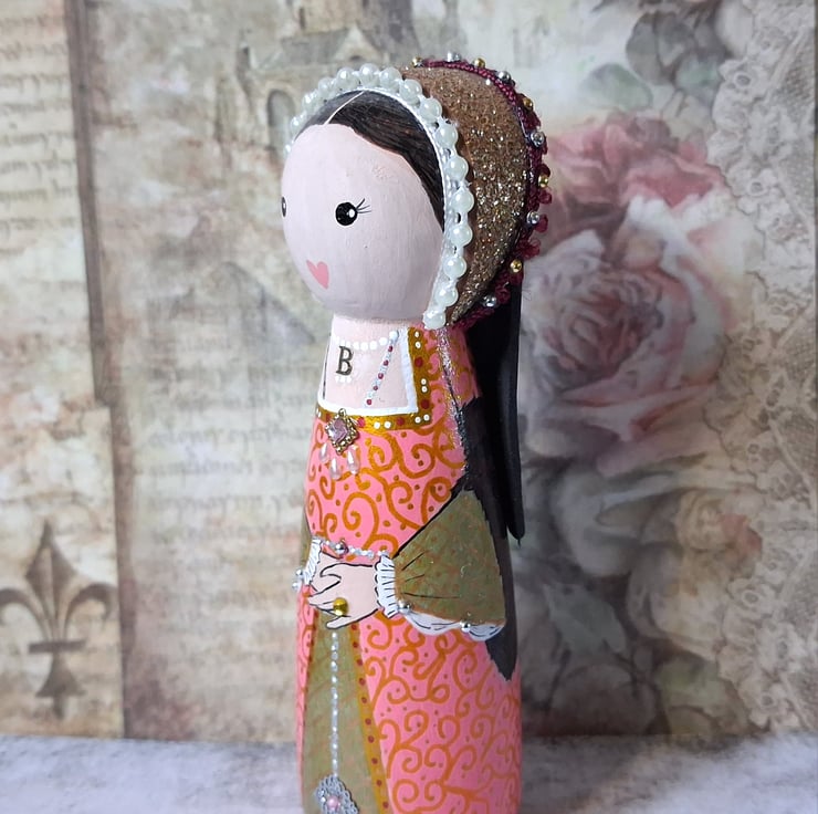 Hand-painted and decorated Anne Boleyn peg doll.