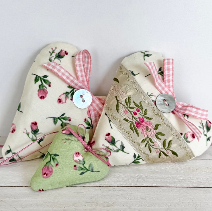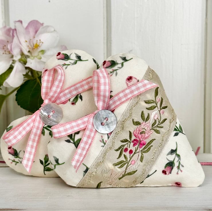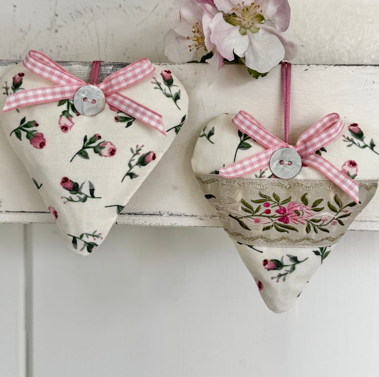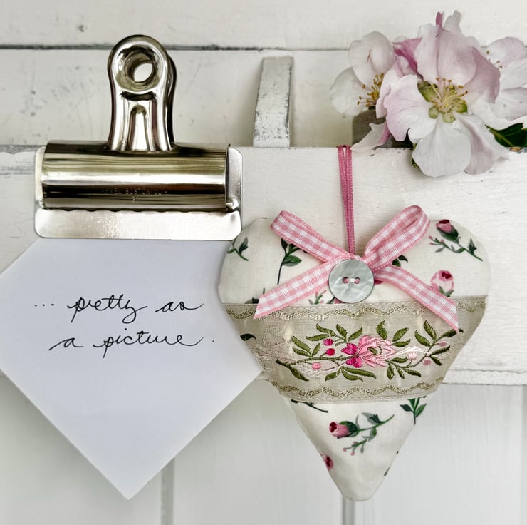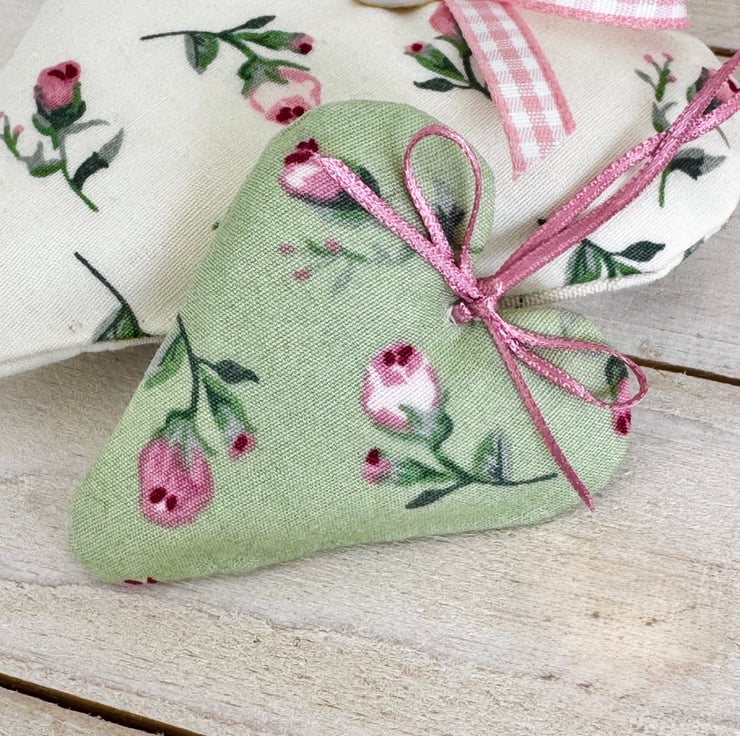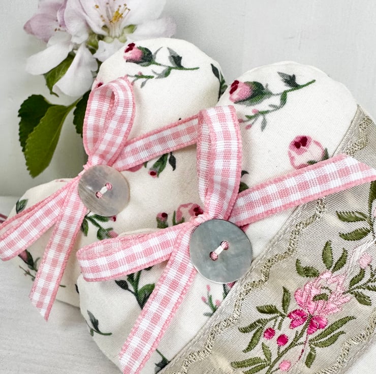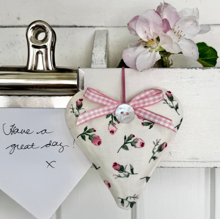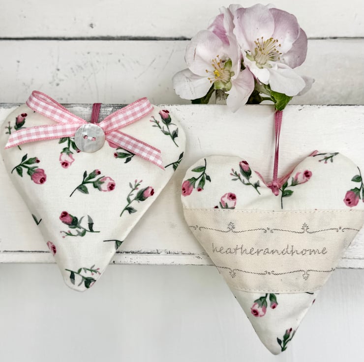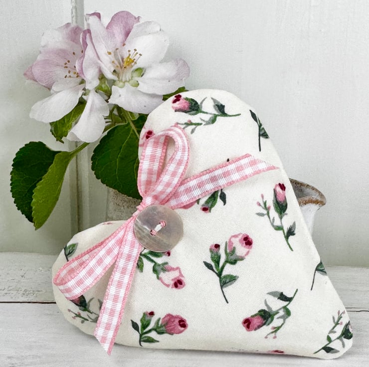 A beautiful floral heart - pink rosebuds are strewn over an ivory cotton background, and there's the option of a pretty ribbon band featuring a garland of pink blooms and delicate foliage. Both designs can be filled with either beautifully fragrant and relaxing Hampshire lavender or with hypoallergenic wool toy stuffing, and both feature a shimmery mother-of-pearl button, a pink and white gingham ribbon bow and narrow pink satin ribbon hanging ties, plus an ornate cursive-script 'heatherandhome' cotton label across the reverse side.
