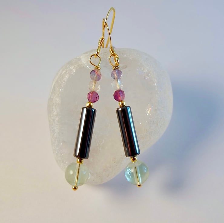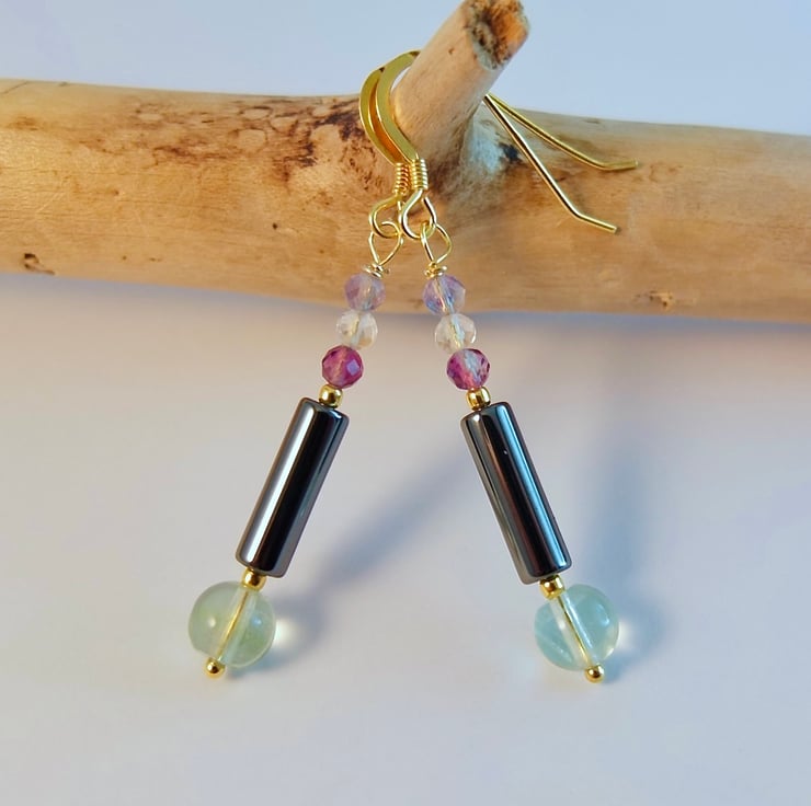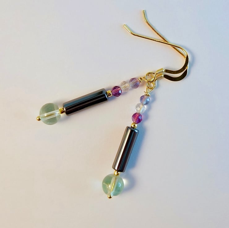 Each earring features a translucent 6mm green fluorite beads with a 4mm x 13mm Haematite tube and a trio of 3.25mm faceted Fluorite in shades of purple, white and blue-green.