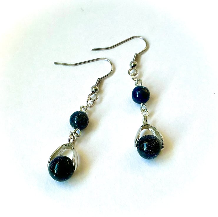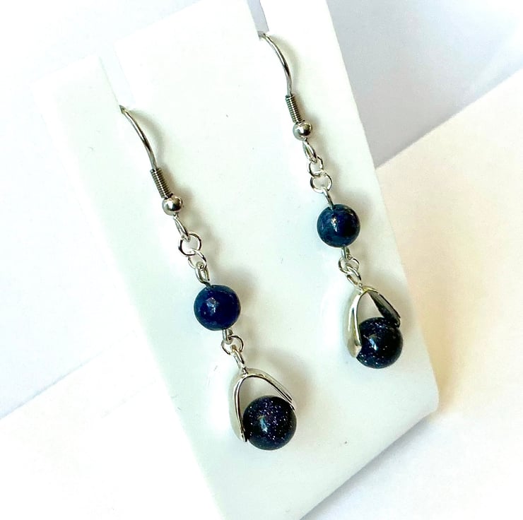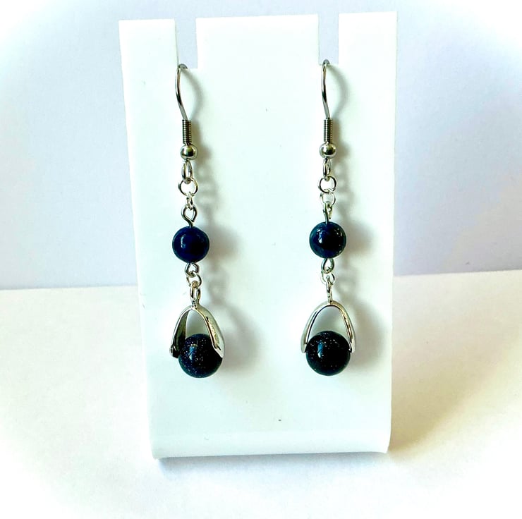 Deep Navy Blue drop earrings made using Goldstone beads.