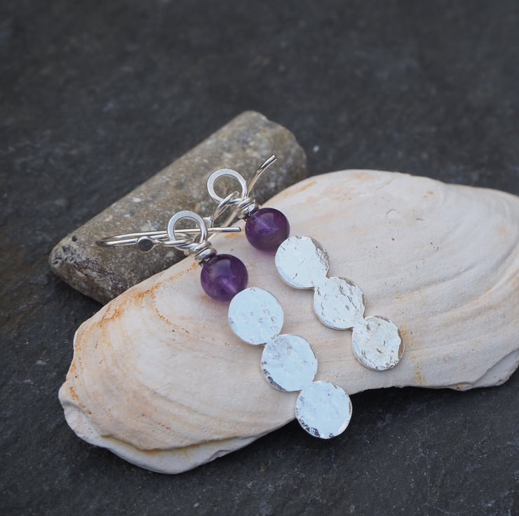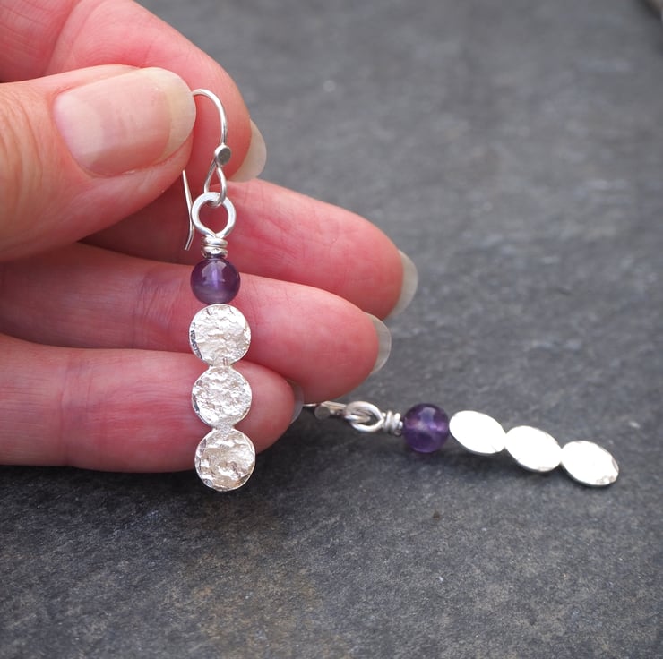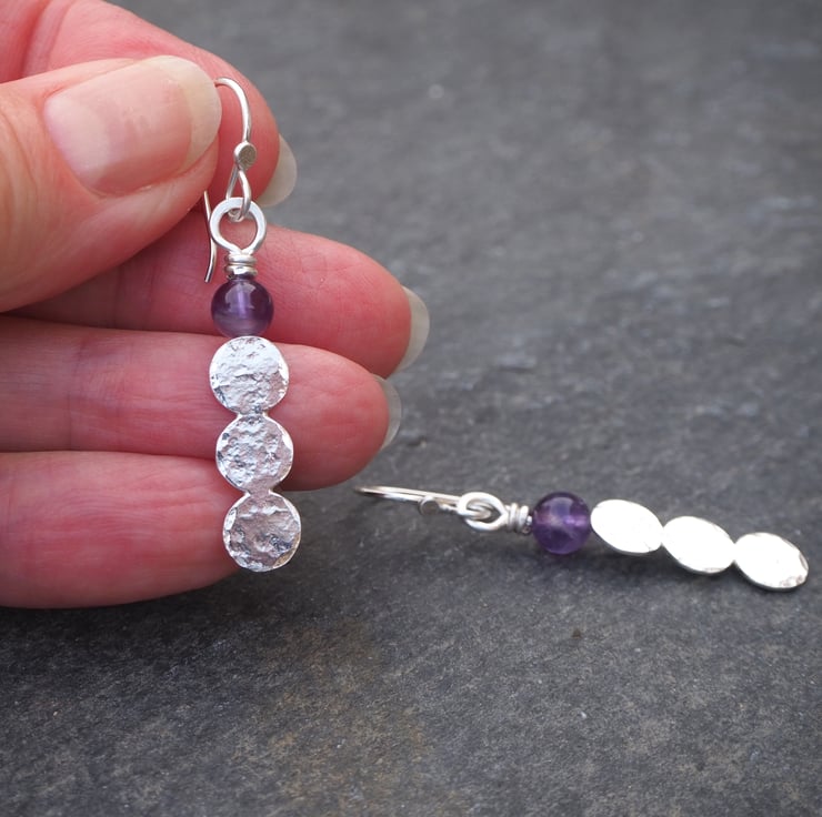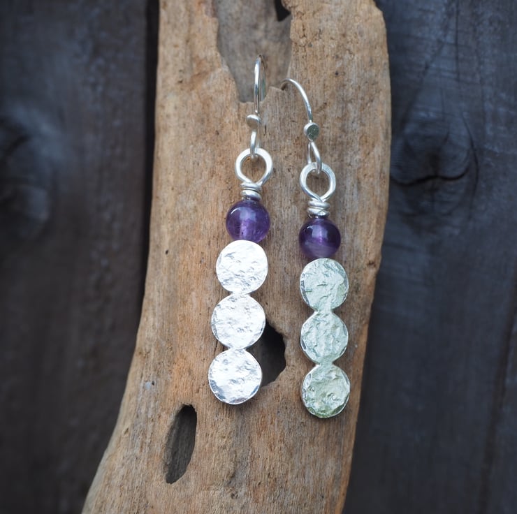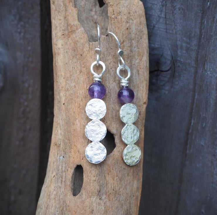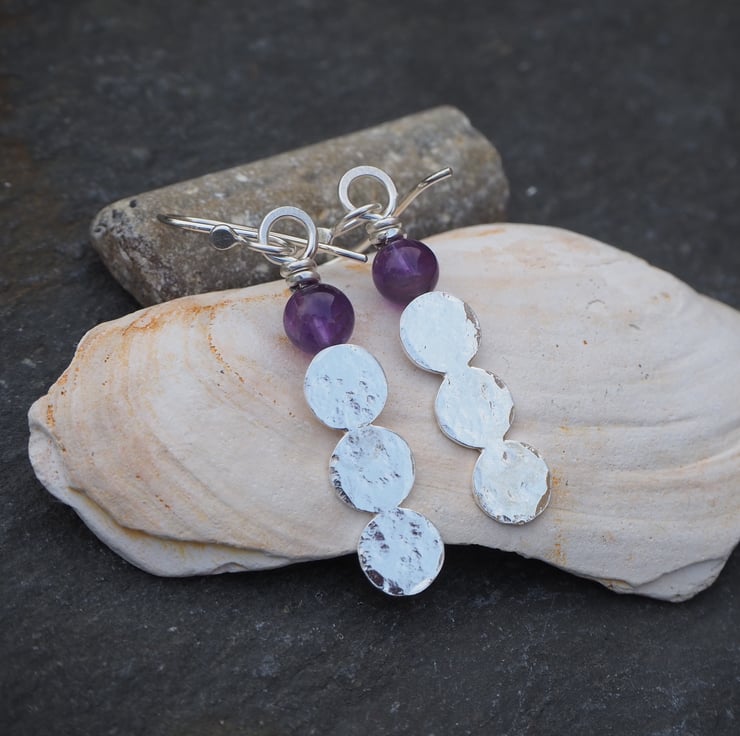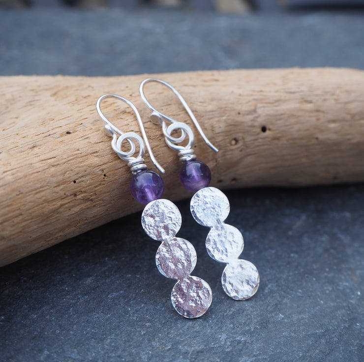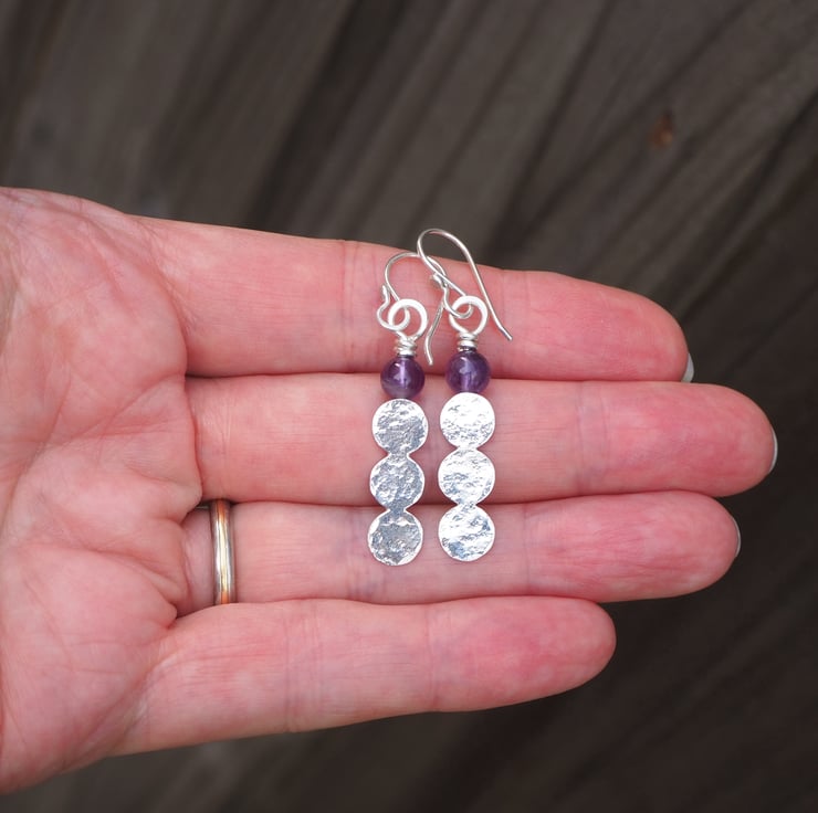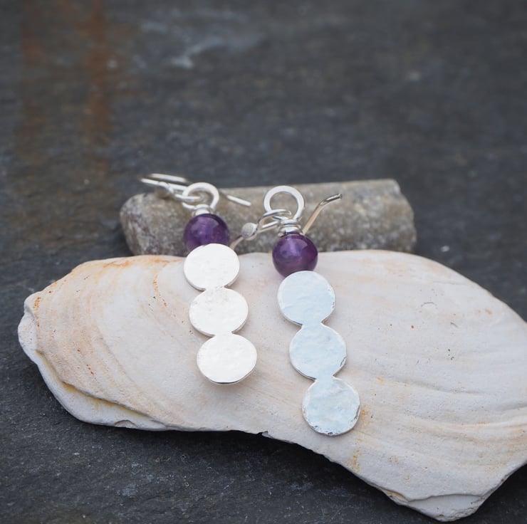 Handmade earrings with 3 hammered silver discs fused together topped with an amethyst sphere bead.