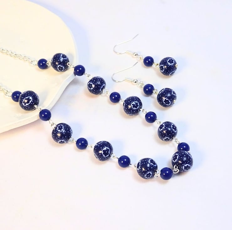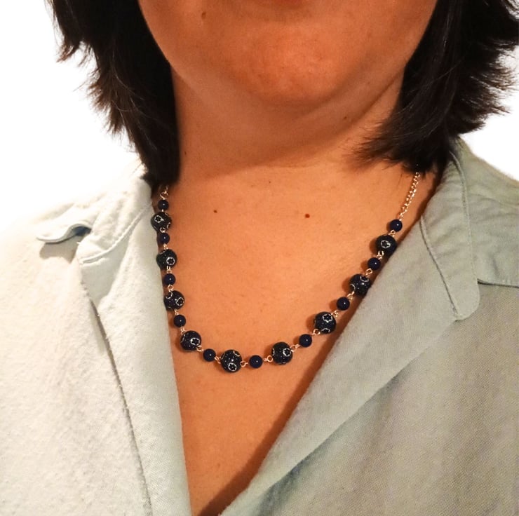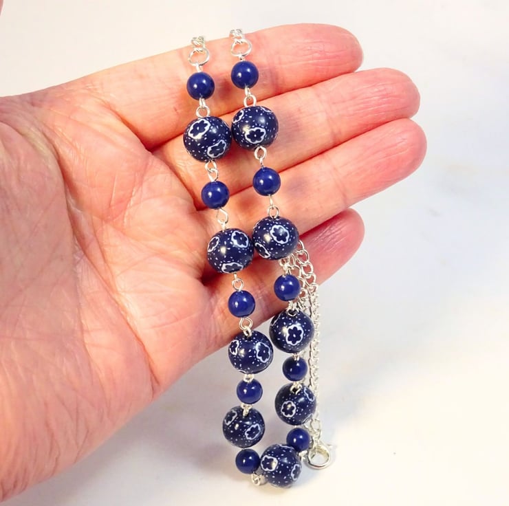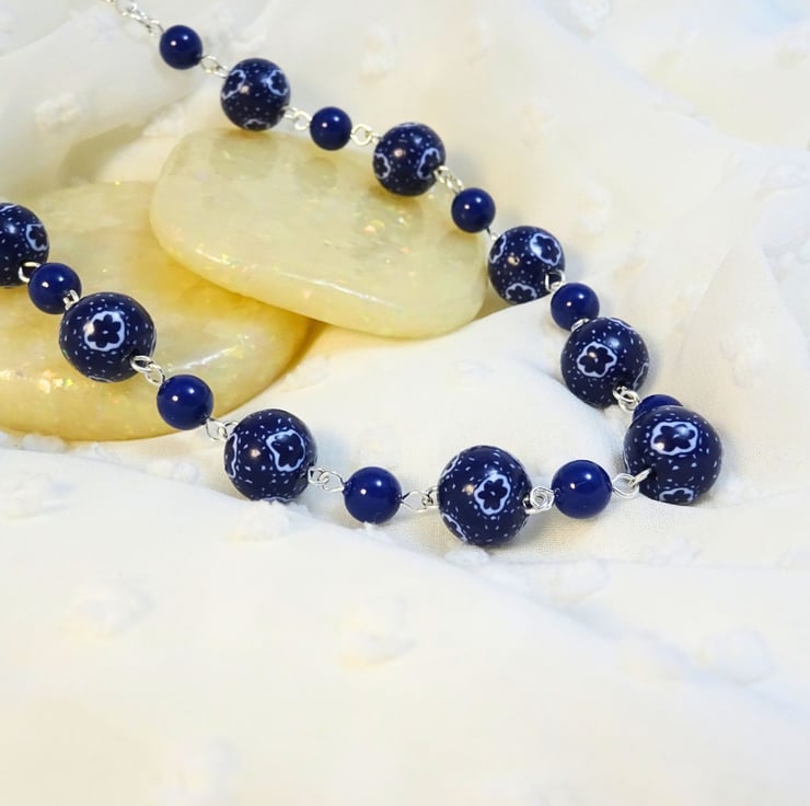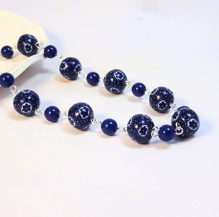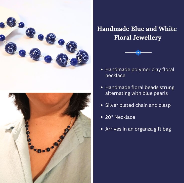 The blue floral beads in this necklace have been handmade from polymer clay using a technique called cane work. The clay is built into the flower and polka dot pattern then applied to dark blue clay to make the beads. These floral beads are alternating with navy blue pearls on silver plated chain.