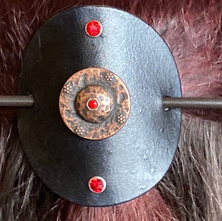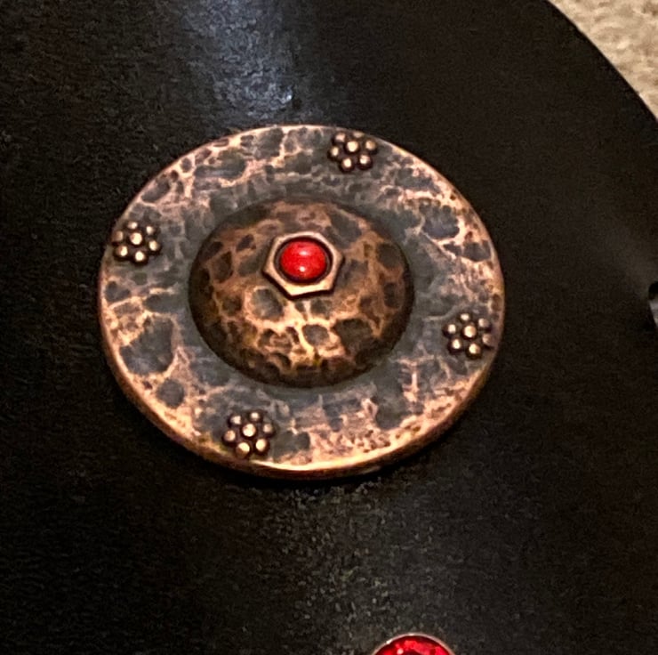 Shape: Circle ... Size: 3.5" in diameter ... Hand dyed black // acrylic finishing spray to seal in leather dye ... The Bronze Shield Centre (with a red stone in the center) is Bronzed in finish and screwed onto the leather piece - 2 Red Gemstones are riveted above and below the shield.