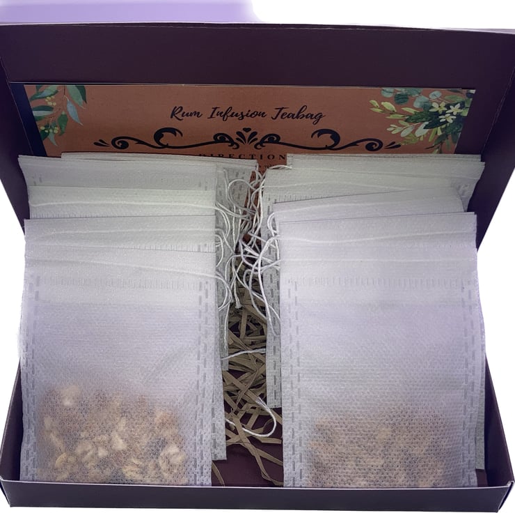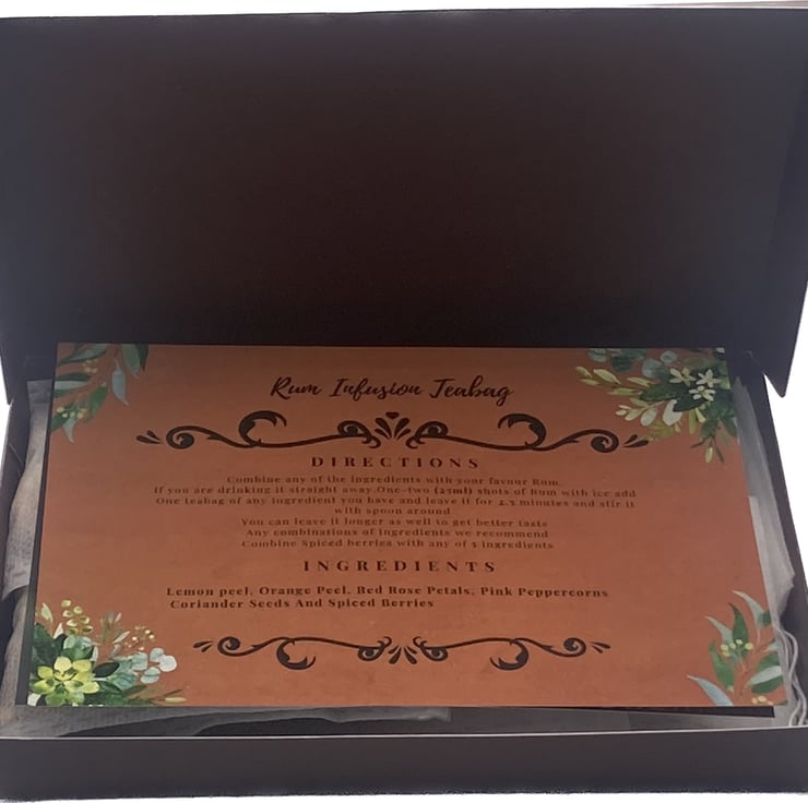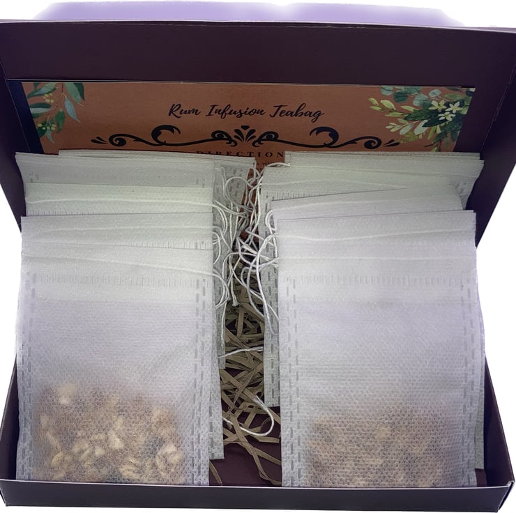 The home brewing kit box contains 12 Tea Bag Cotton Drawstring Seal (7X9cm Size) filled with botanicals and also information description on the ingredients .It is so easy to use, by dropping a Tea Bag to your rum or cocktail and let it infuse for a few minutes, before adding ice.