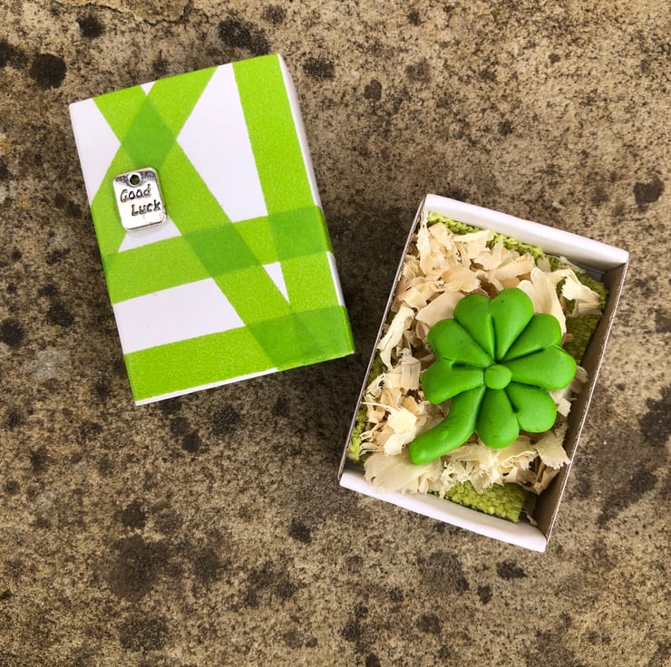 Whether it is upcoming exams, a job interview, an operation or a life event, we could all do with a bit of luck sometimes... Show someone that you are rooting for them with this lovely wee polymer clay 4-leaf clover in a pretty little presentation matchbox. I can't guarantee that it will make you win the lottery, but who knows!