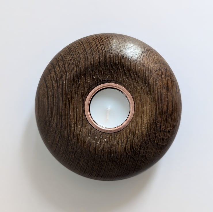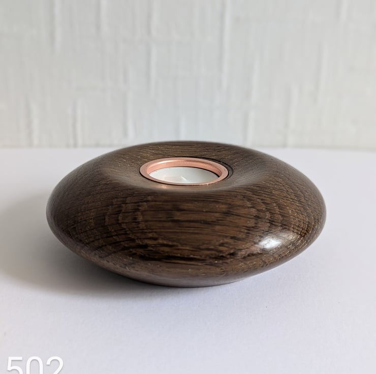 Turned wood tealight holder. Antique Oak. Approx 6 inch wide by 2 inch high. (150mm x 50mm).