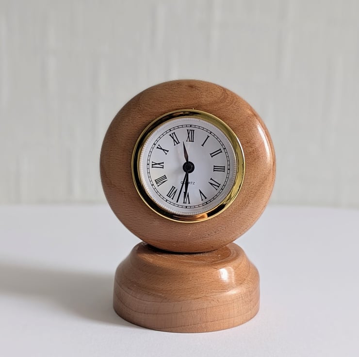 A bespoke turned clock of approximately 6 inches (150mm) in diameter and 2.5 inches (65mm) depth and 4 inch (103mm) clock face. Made from Cherry wood and a Gold coloured clock face. Each clock is a one of a kind. Battery operated (battery not included for safety reasons). Other clocks available, please see other listings.
