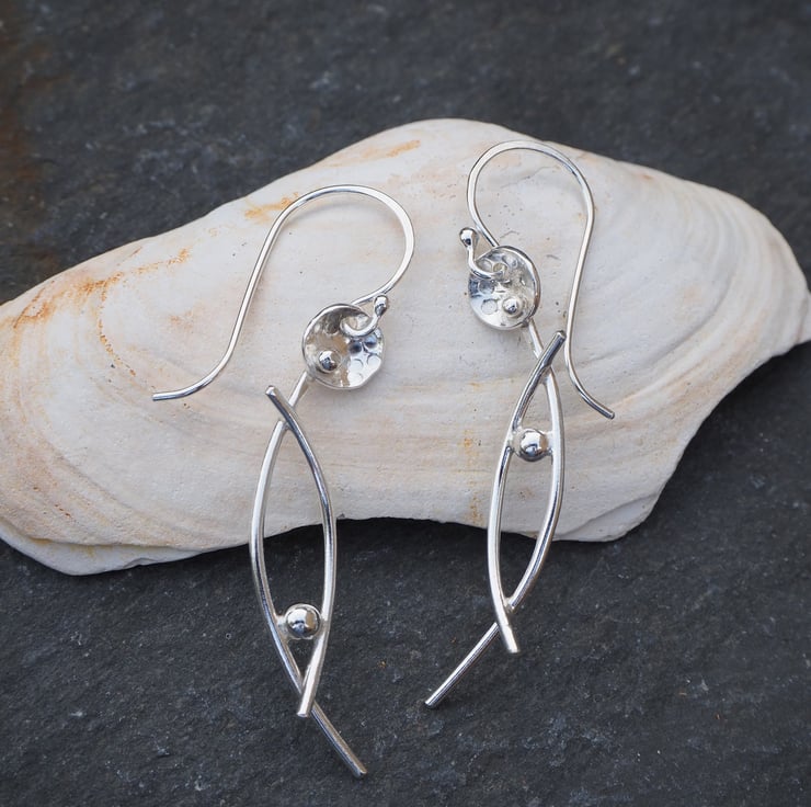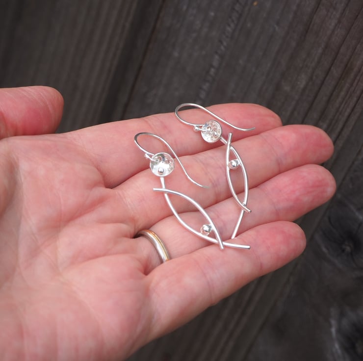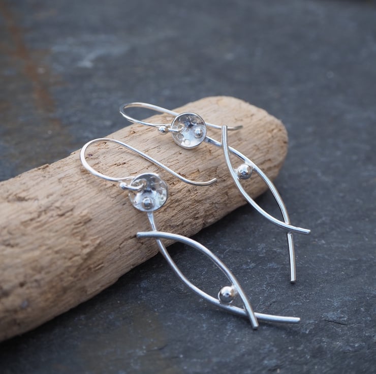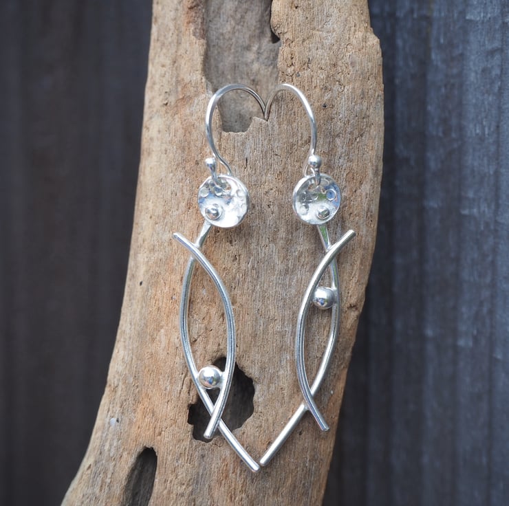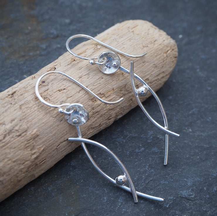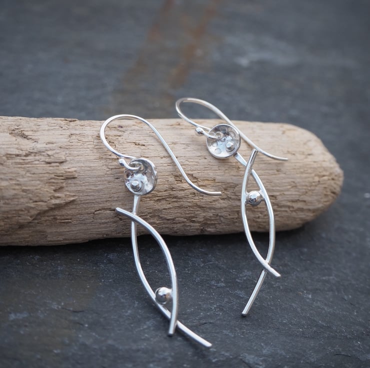 Handmade silver dangle earrings in an abstract stylised flower design. The stems have a lovely arc shape and I've added some delicate texturing to the flower heads.