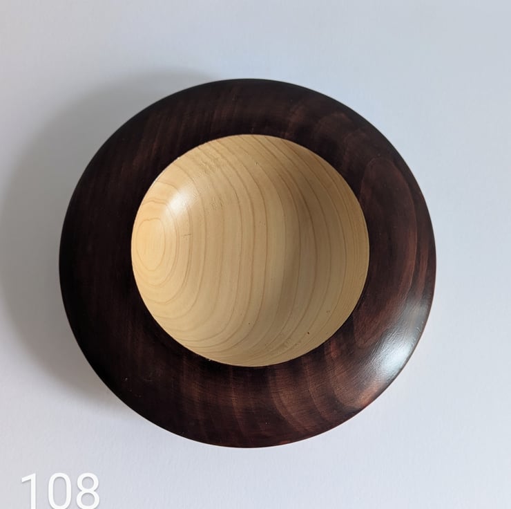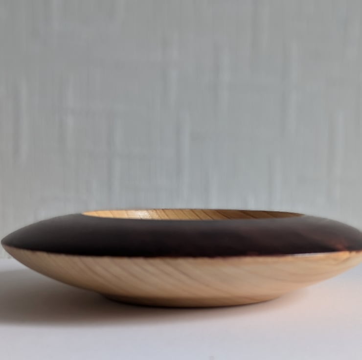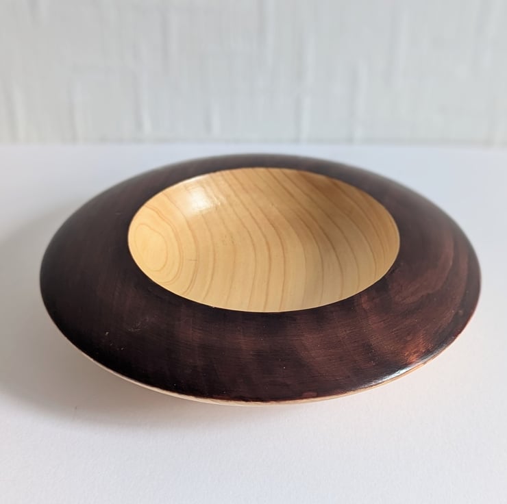 Turned wood bowl made from Leylandi. Stained with contrast rim. Approx 9 inch diameter by 2 inch high. (230mm x 50mm).