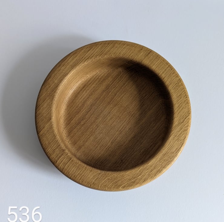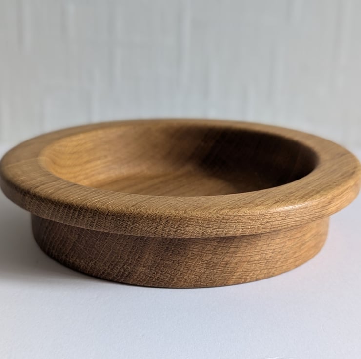 Turned wood bowl with rim, made from Oak. Approx 9 inch diameter by 2 inch high. (230mm x 50mm).