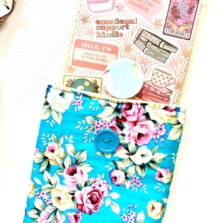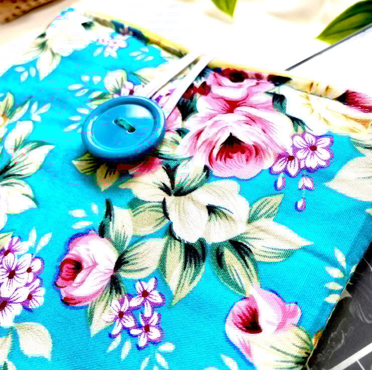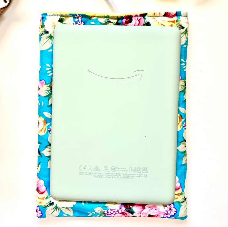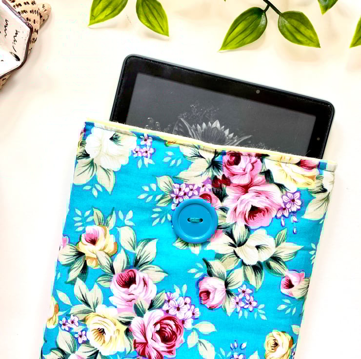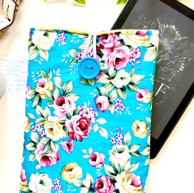 Handmade blue floral padded kindle sleeve / e reader case. It has a contrasting lemon cotton lining. This lovely fabric sleeve has been made to fit various sizes of kindles, please see below.