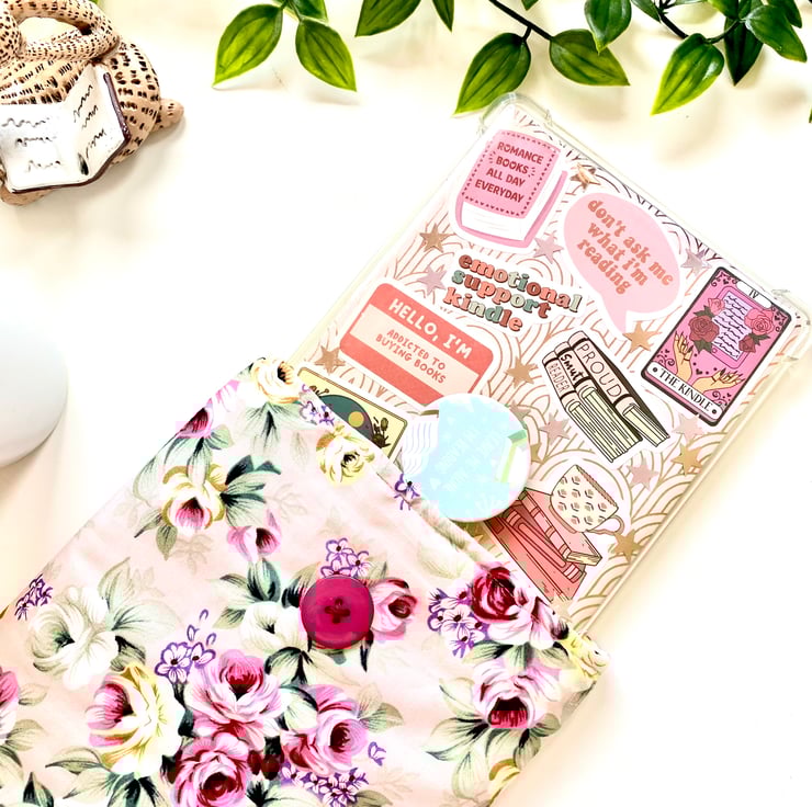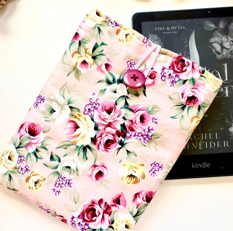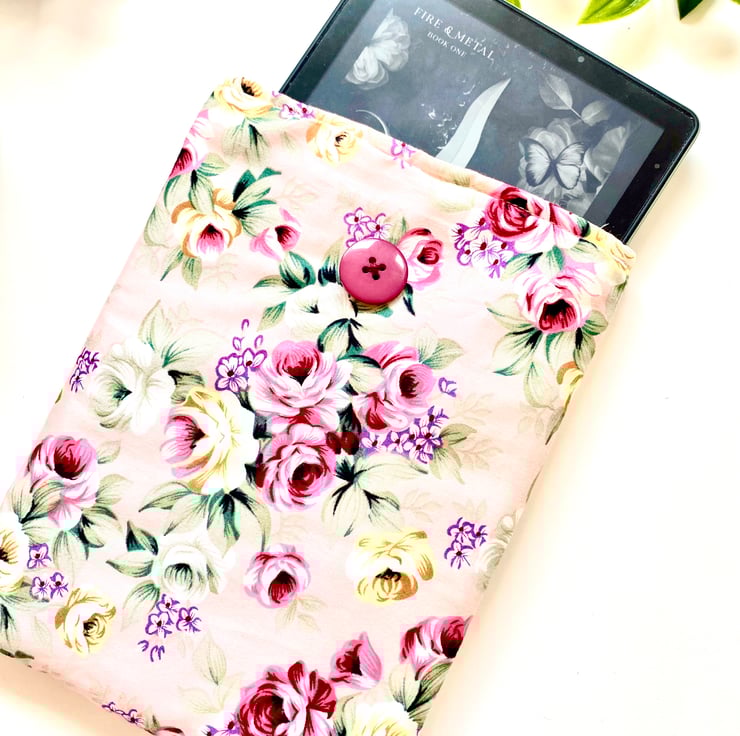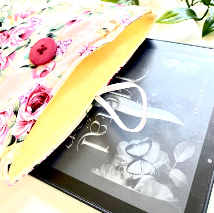 Handmade pink floral padded kindle sleeve / e reader case. It has a contrasting lemon cotton lining. This lovely fabric sleeve has been made to fit various sizes of kindles, please see below.