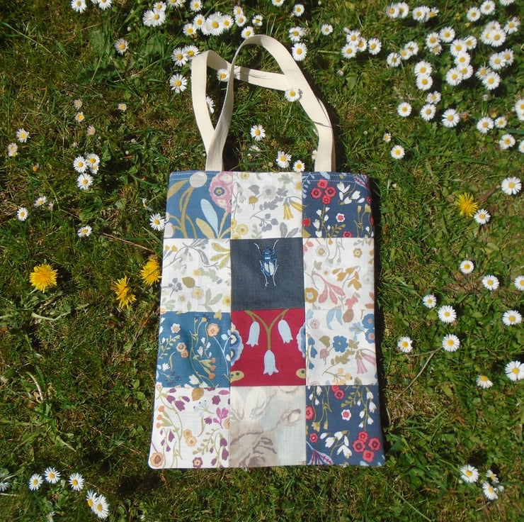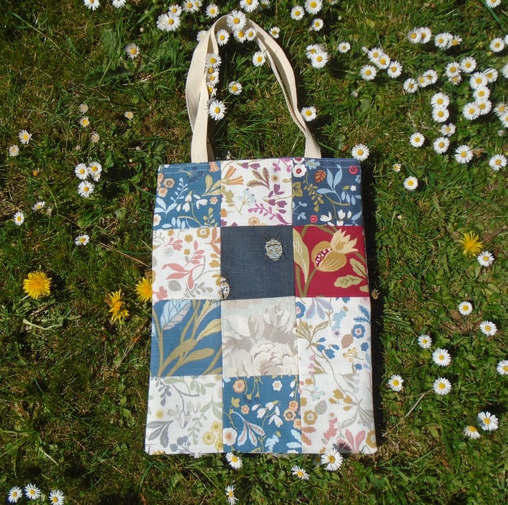 Small tote bag Size 33 cm x 25 cm . The bag is lined and the picture shows a typical example each one unique with coton floral patches. Great gift idea.