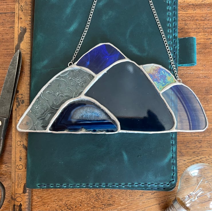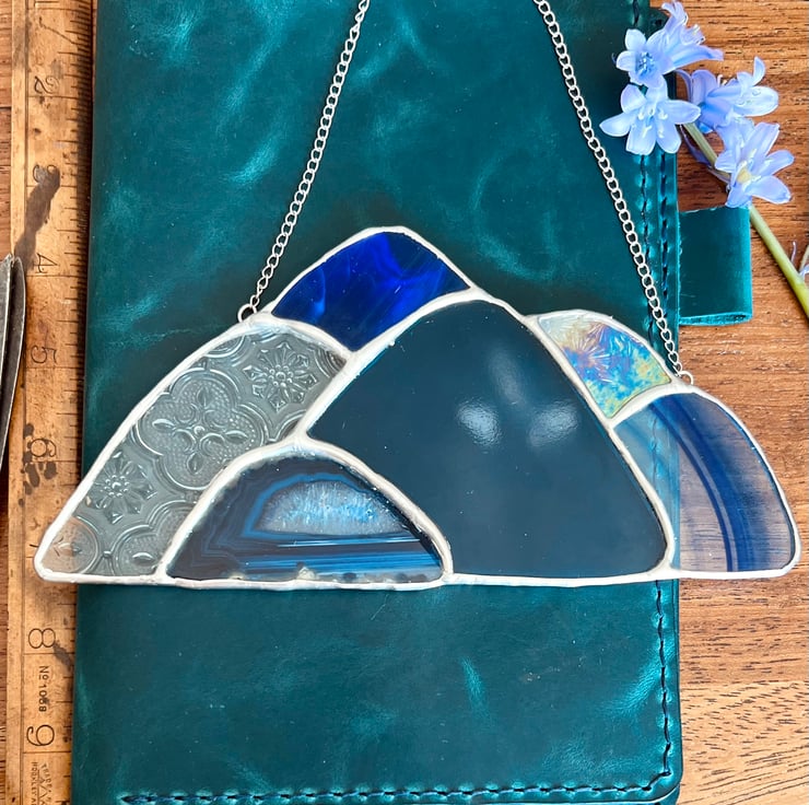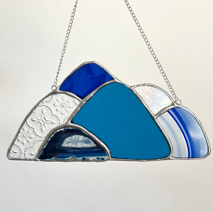 A completely unique stained glass hills artwork in a stunning range of blues, including a slice of agate. A perfect piece for an outdoorsman, hiker, adventurer, or landscape lover.
