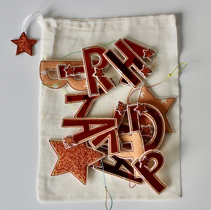 Each of the thirteen letters and two stars suspended along this garland, is sewn using a combination of 100% wool felt, cotton cloth, shining fabric and free hand machine embroidery; multiple layers of cloth are sewn together and cut out by hand using very sharp scissors. Each letter has a sewn glitter fabric star.