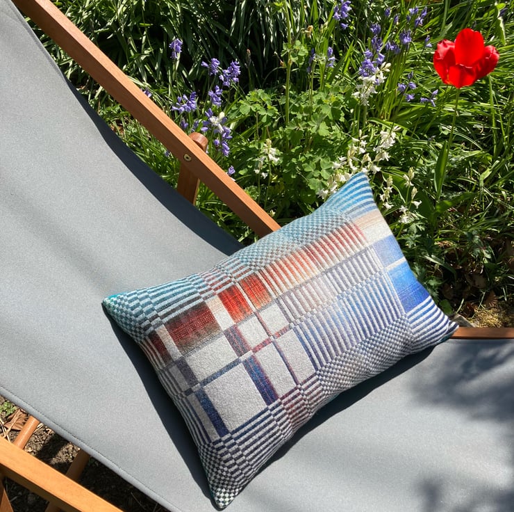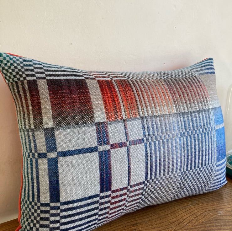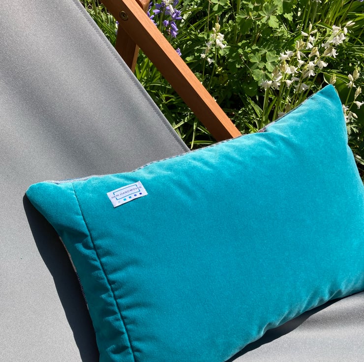 A gorgeous lambswool cushion in doubleweave, inspired by the view from the Quarterdeck in Robin Hood’s Bay. My postcard to a beloved haunt. An abstract composition featuring over 30 shades of Yorkshire lambswool, all mill-end yarn left over from commercial textile production and saved from going to waste. this cushion cover is backed with teal deadstock velvet. It will fit a cushion insert measuring 60cm x 40cm. I’ve not included the insert, to keep shipping costs down.