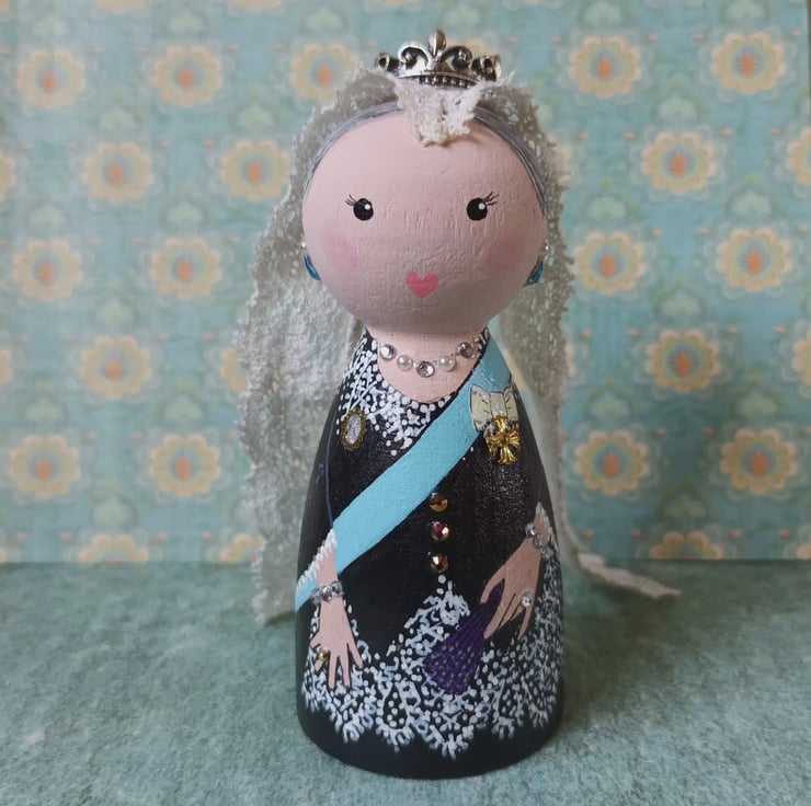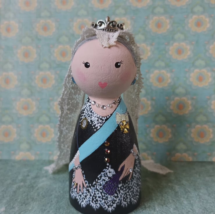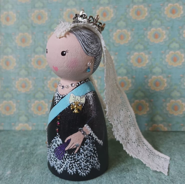 Queen Victoria in her later years. My own design based on portraits of the time, vintage lace trim.