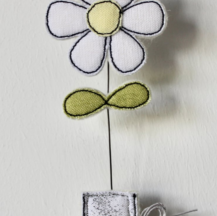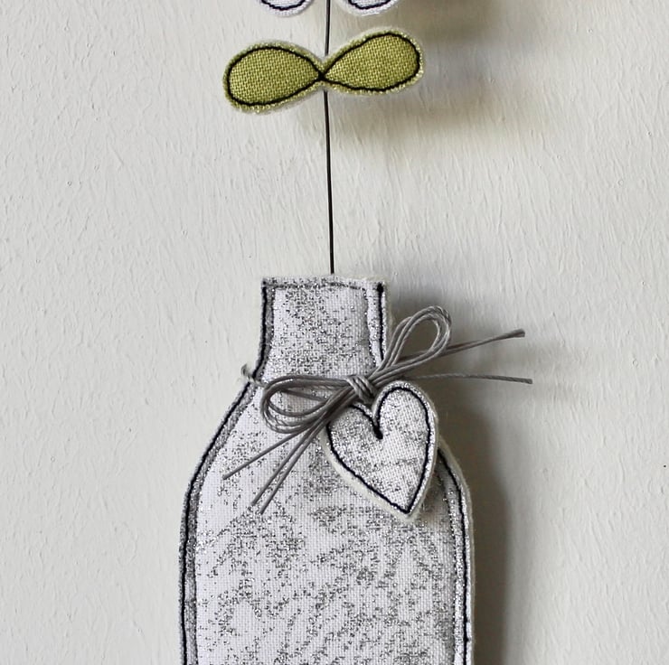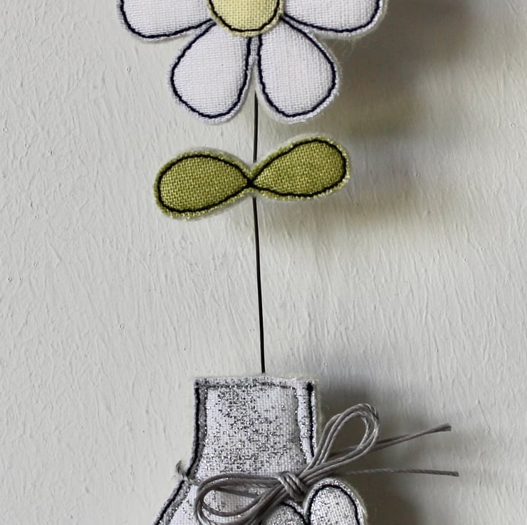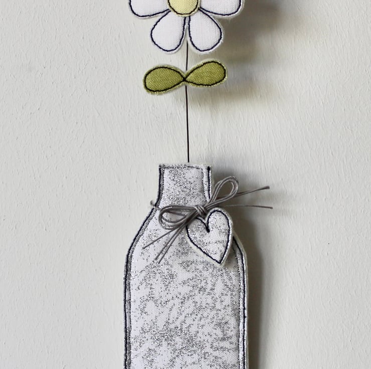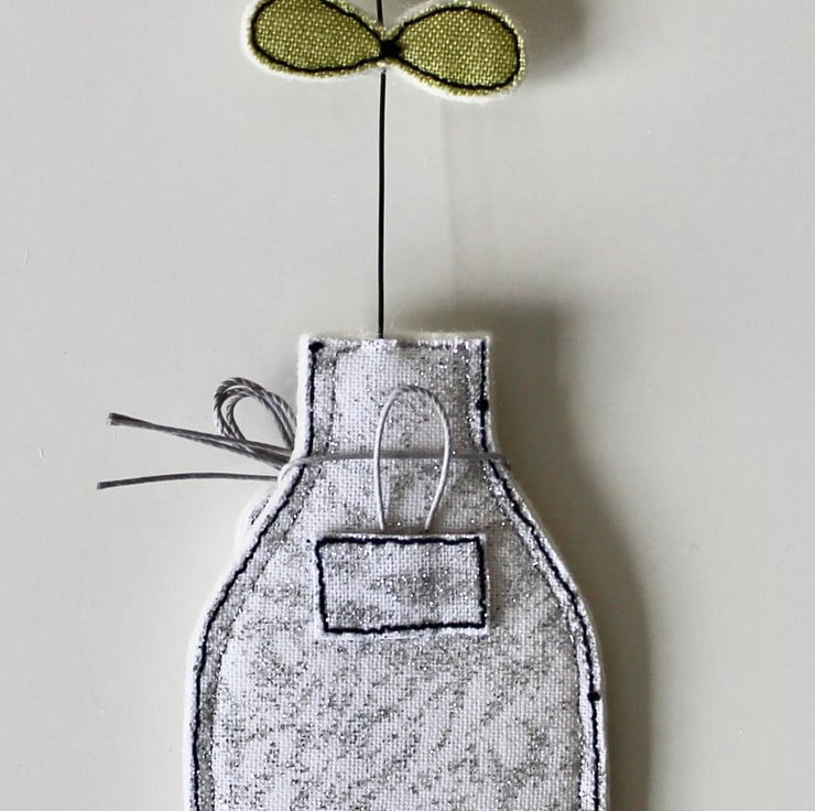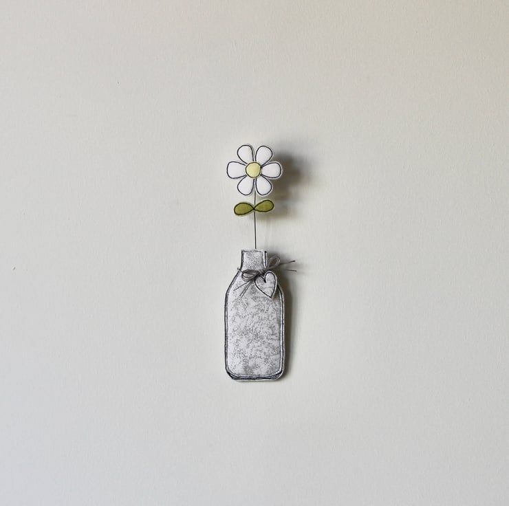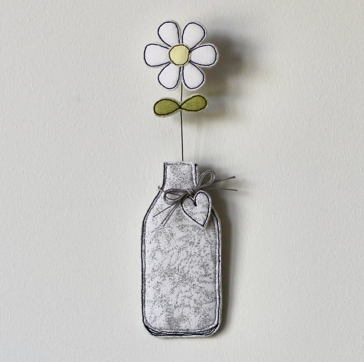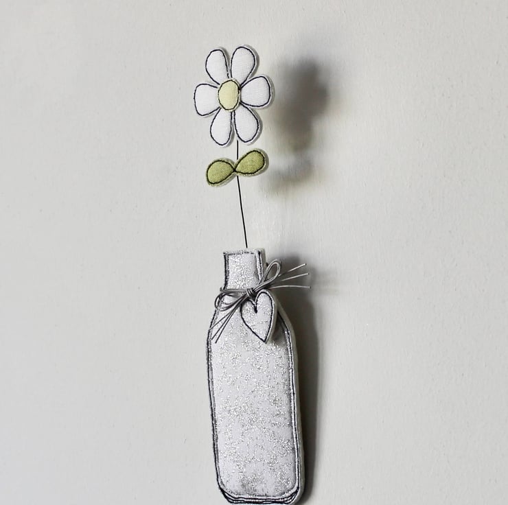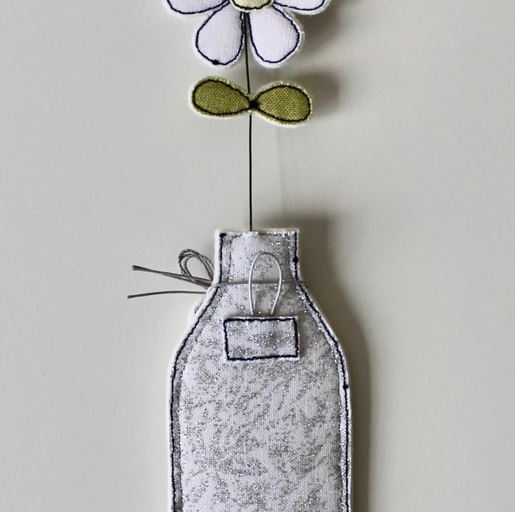 'Daisy in a Bottle' is created using 100% cream wool felt, glittery cotton cloth, plain cotton cloth, wire, linen thread and free hand machine embroidery; multiple layers of cloth are sewn together and cut out by hand using very sharp scissors.