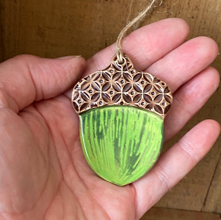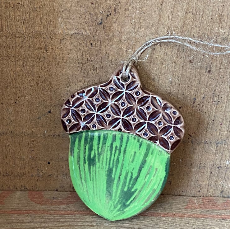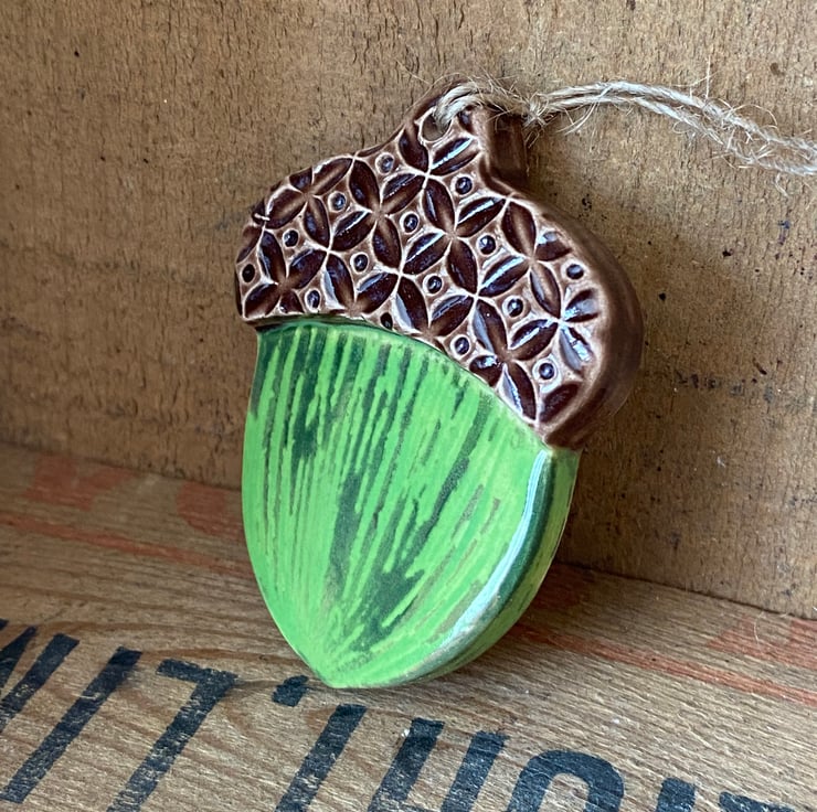 This little pottery acorn has been cut from white earthenware clay, decorated and fired. It has then been glazed with bright, glossy glazes and fired again to 1100 degrees. It hangs from a brown string. 5cm wide x 6cm high x 0.8cm deep. Suitable for indoor or outdoor use.