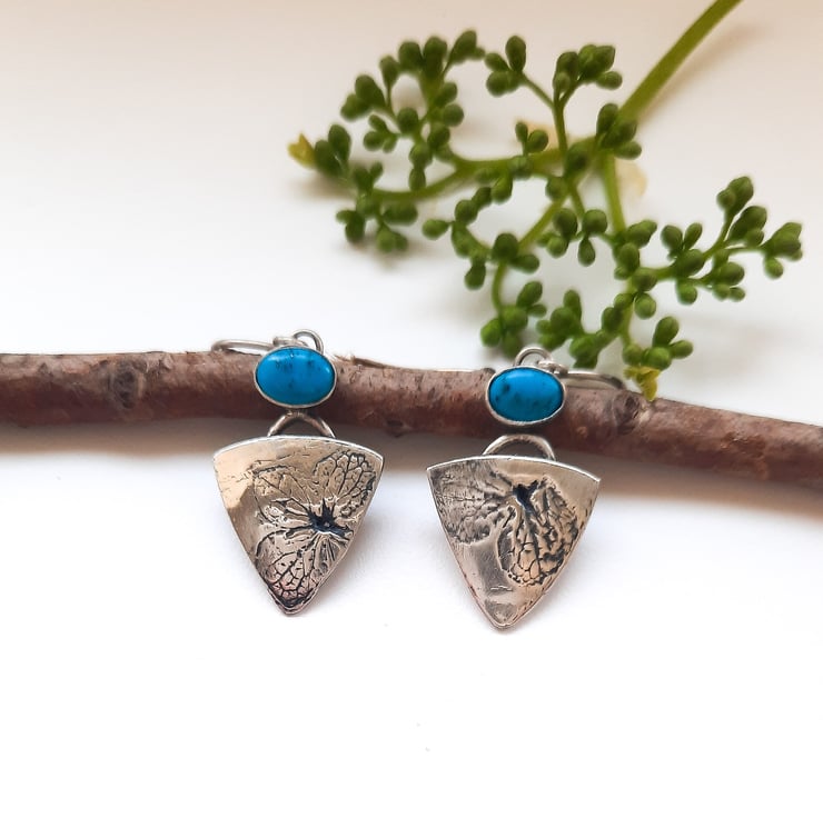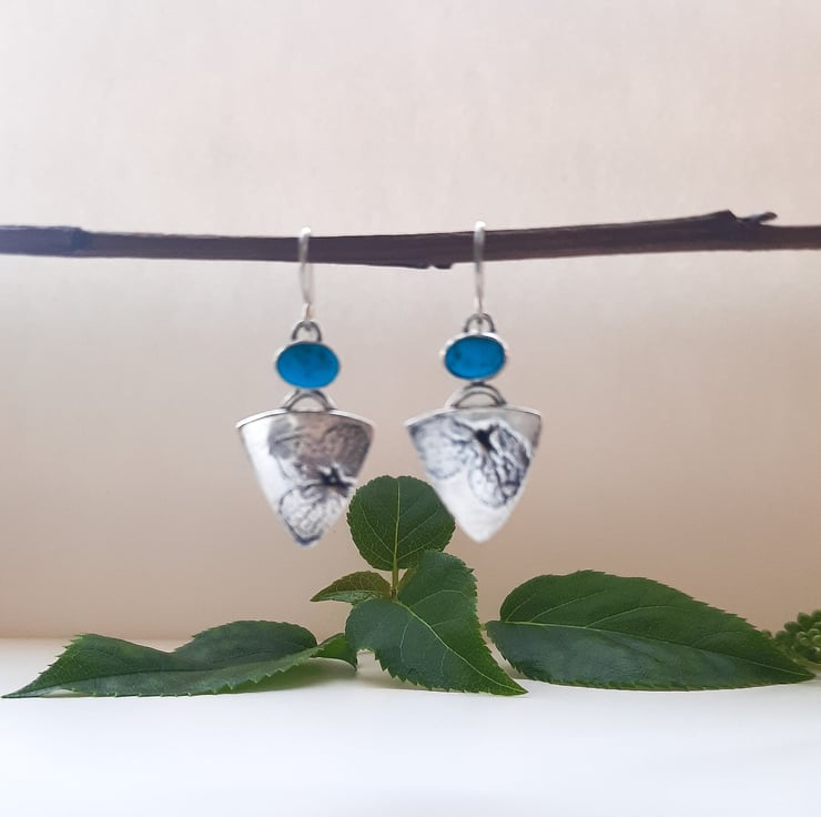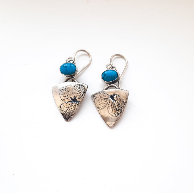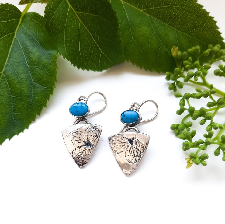 Handcrafted, turquoise hydrangea leaf earrings, made from recycled fine silver. Part of a hydrangea leaf is featured on each earring. A turquoise matrix gemstone sits above each earring. I would advise against immersing the earrings in water as this could loosen the gemstones over time.
