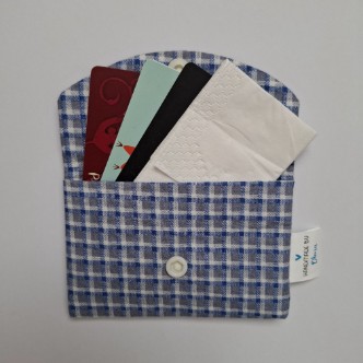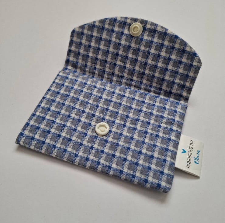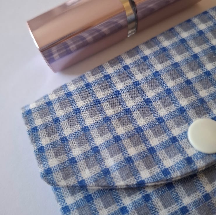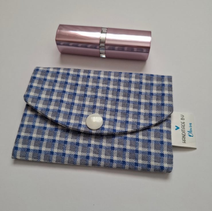 Handmade blue checked card holder made with cotton fabric and has a self-lining. The card holder is fitted with a white snap closure to help keep your items secure.