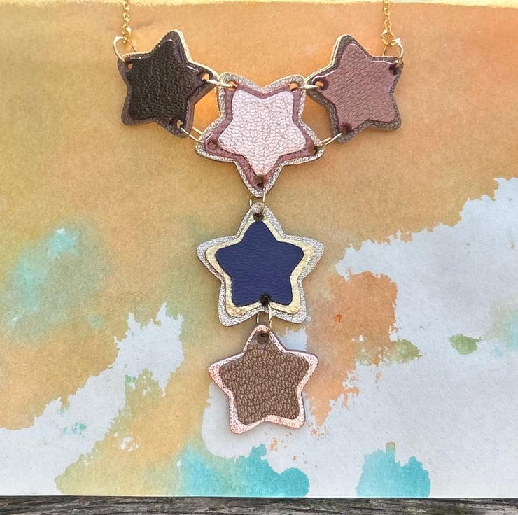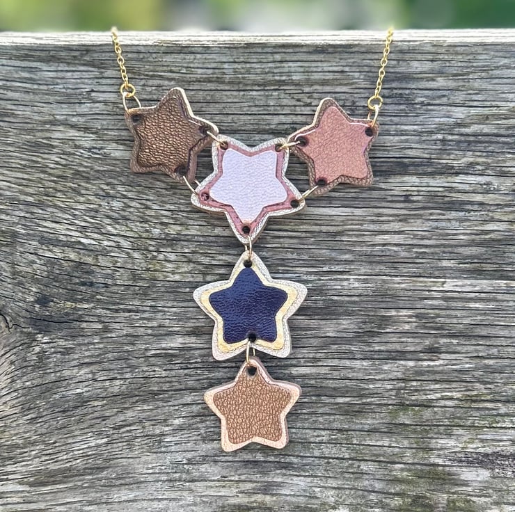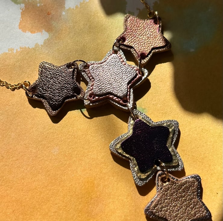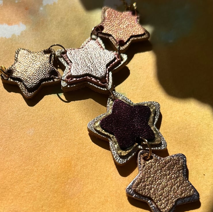The stars are made from layering different colours and sizes of leather together to make a 3 dimensional shape. The leathers are different textures and mostly metallic.