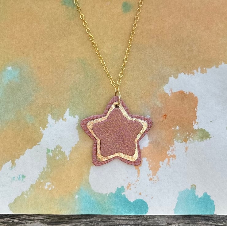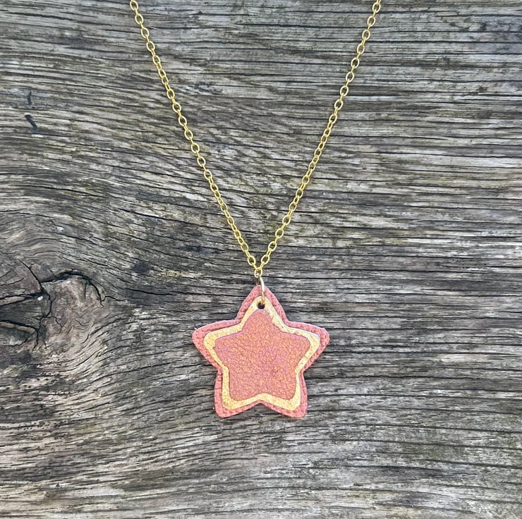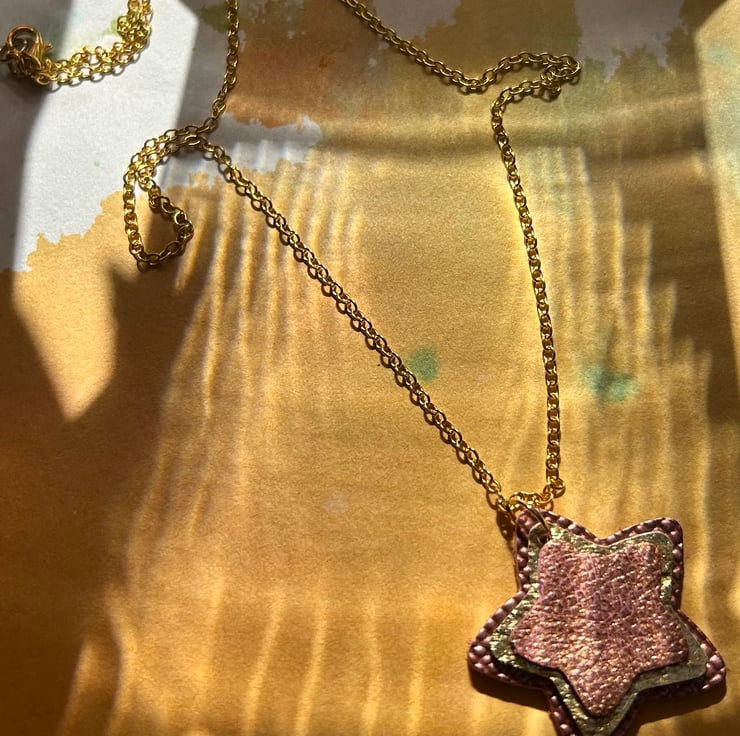 The star is made by layering different sizes and colours of metallic leathers to create a 3 dimensional shape. The star is hung from a 50cm gold coloured hypoallergenic chain (please ask if you’d like a different length)