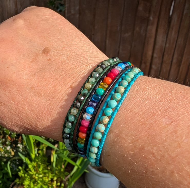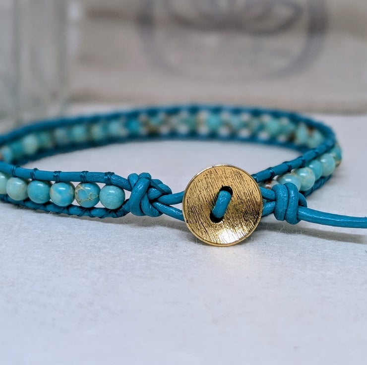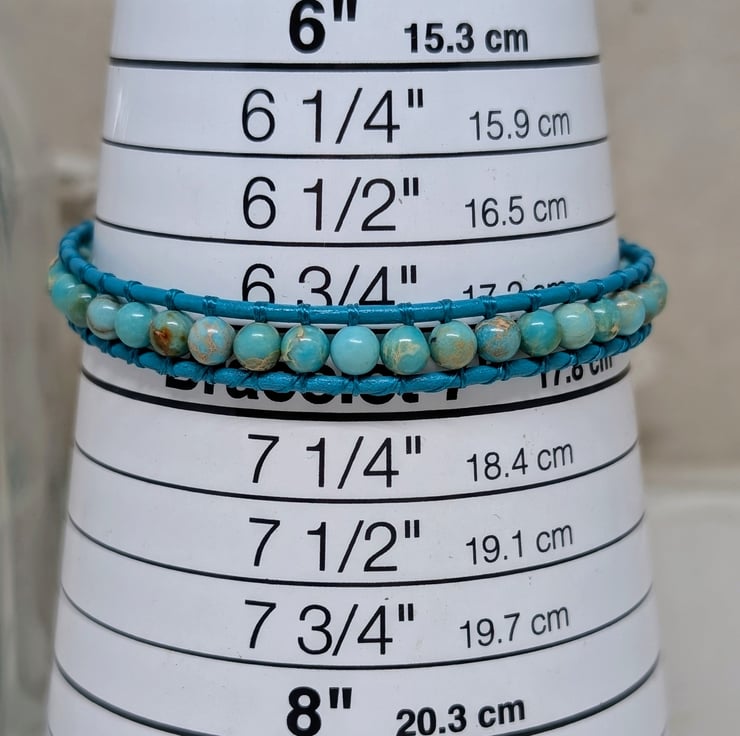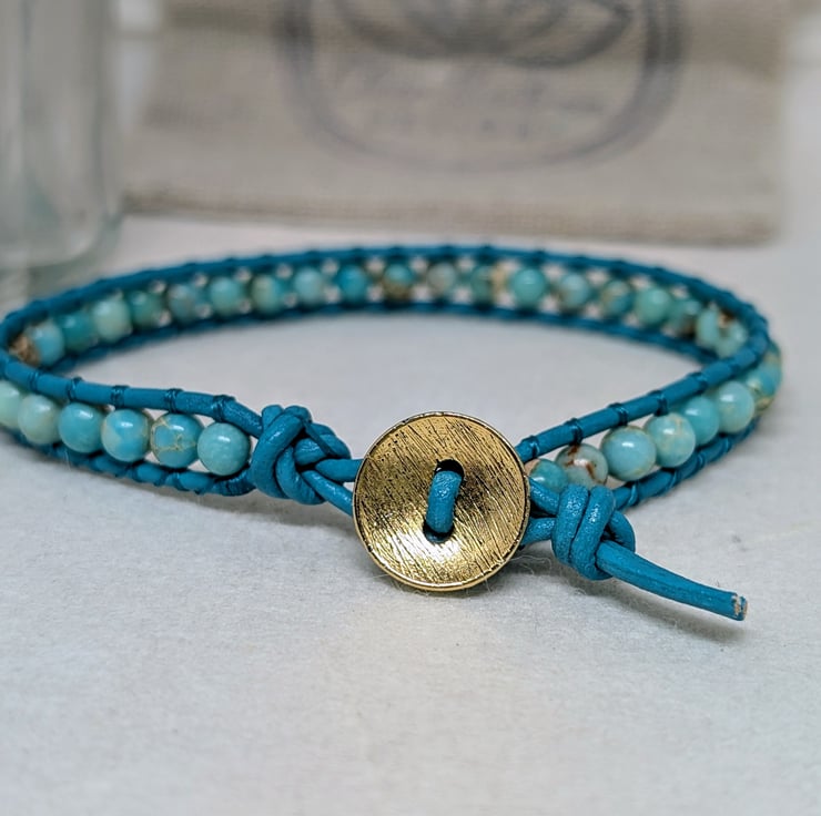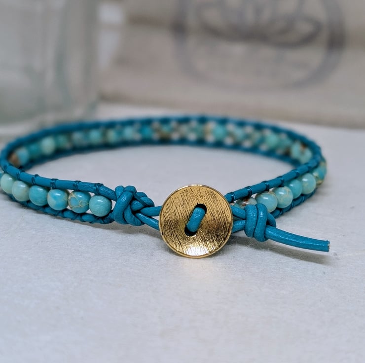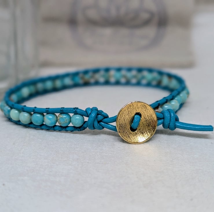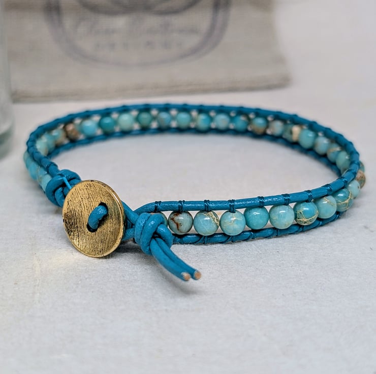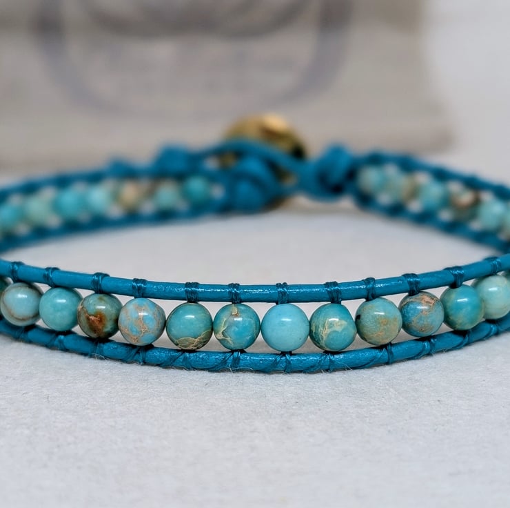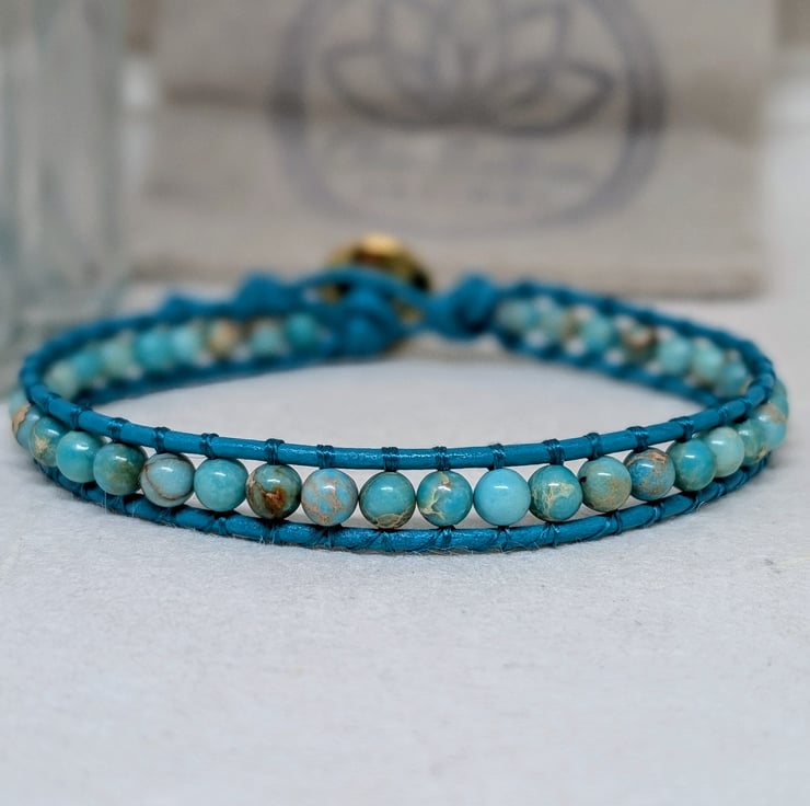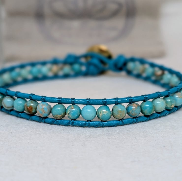 This handmade bracelet features beautiful 4mm round sea sediment jasper beads in a soft pale turquoise shade, stitched securely onto turquoise leather cord. The serene colours evoke the feel of tropical shores, perfect for adding a touch of calm to your everyday style.