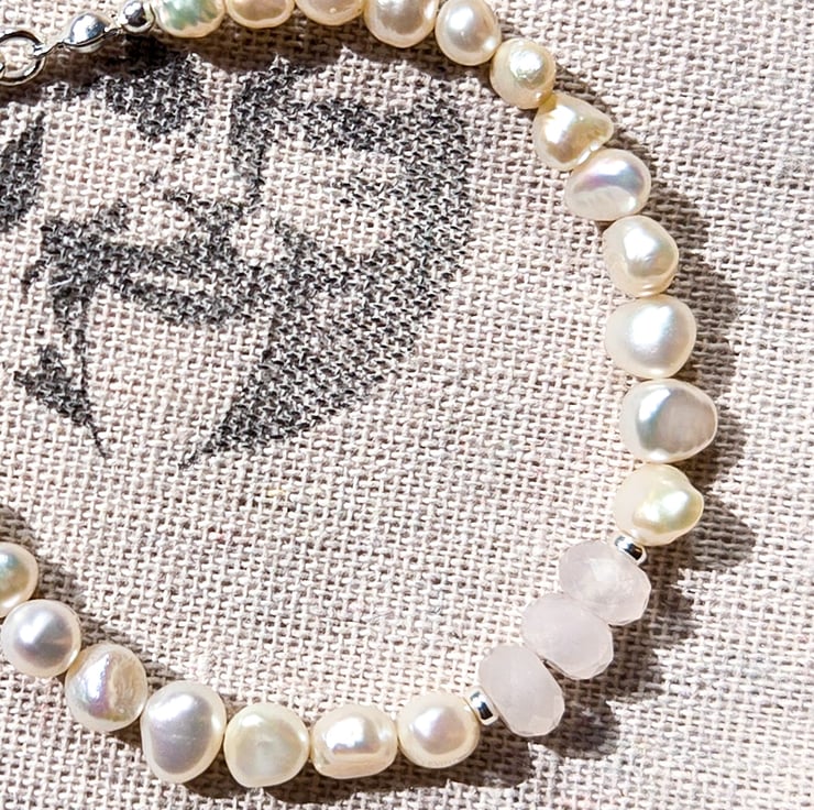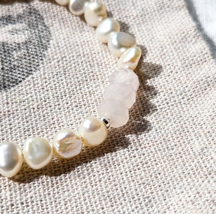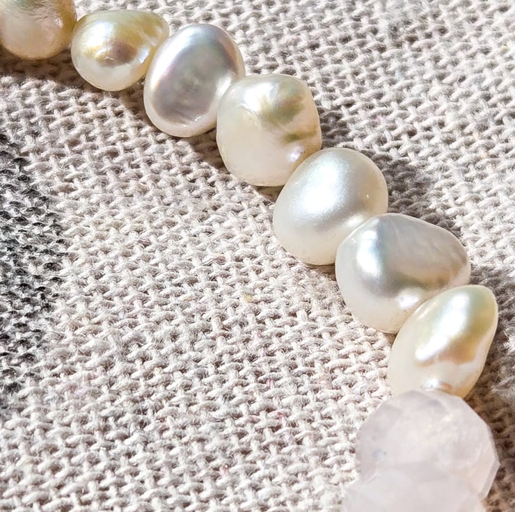 This dreamy little piece one-off is handmade with creamy baroque Freshwater Pearls, and soft pink faceted Rose Quartz gemstone beads.