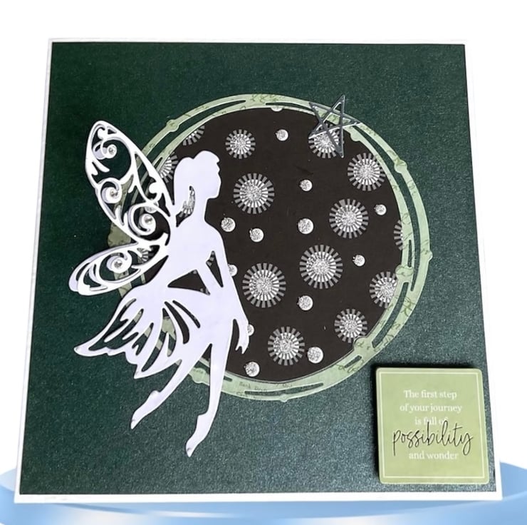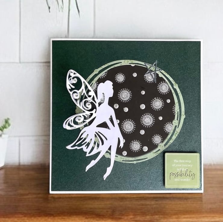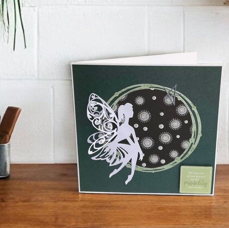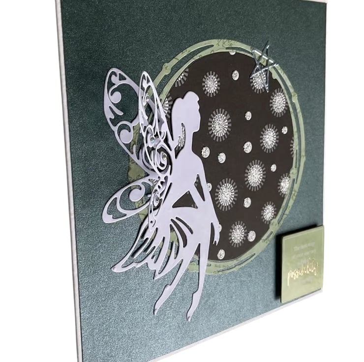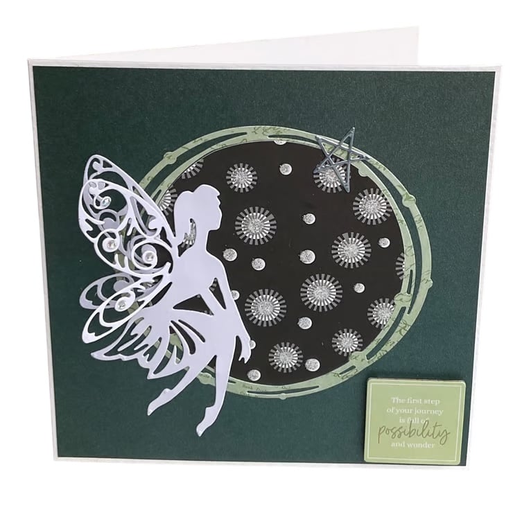 The card has been made with a white hammered base which has been layered with a dark green shimmer card and black and silver paper which has been die cut into a rounded shape. A white die cut fairy sits on a green paper cut out and is making a wish on a single sliver star. The fairy has two sets of wings which have been decorated with silver gems.