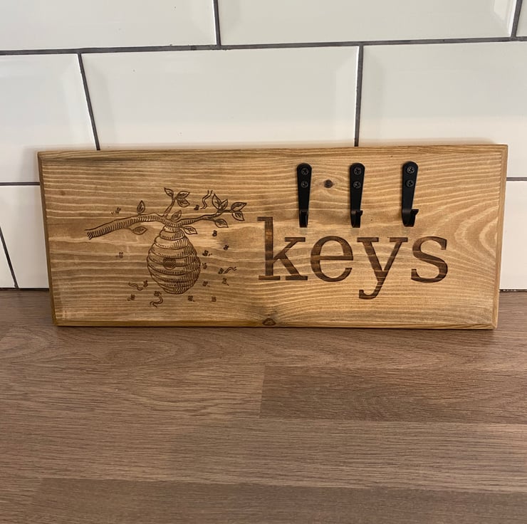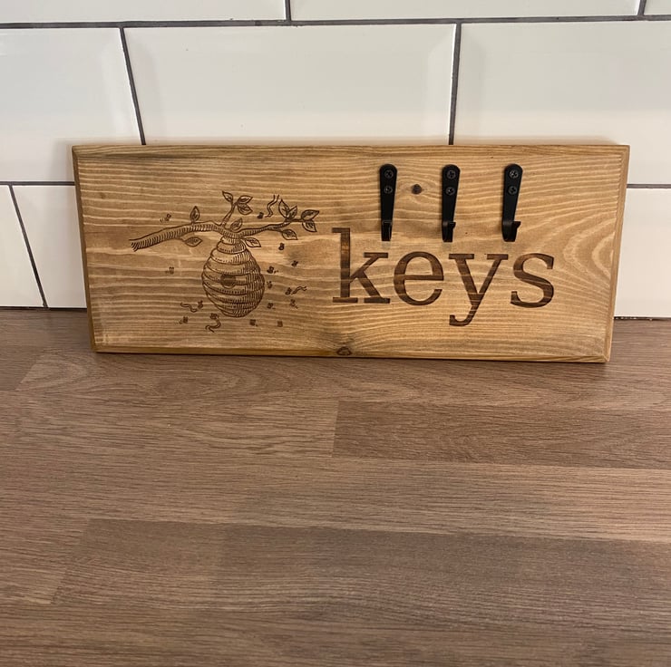 Add a touch of rustic charm to your home with this handmade wooden key holder, crafted from recycled wood and featuring a decorative laser engraved design. This key holder includes two sturdy black hooks, perfect for keeping keys, lanyards, and other essentials tidy in your hallway, kitchen, or entryway. Using reclaimed wood promotes sustainability.