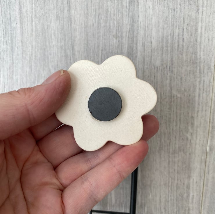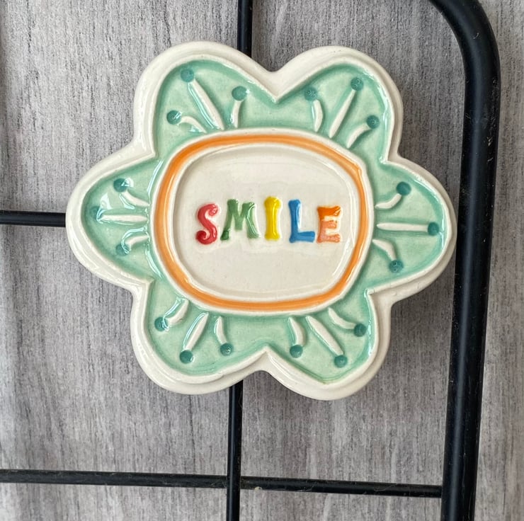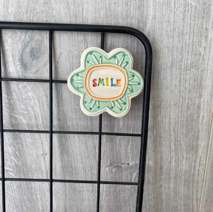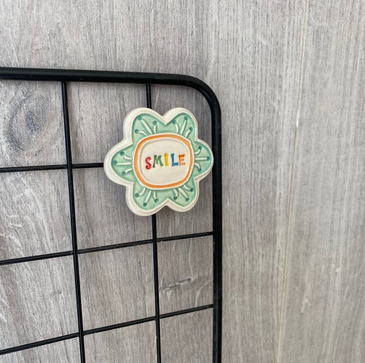 This chunky pottery magnet is made from white earthenware clay and decorated with bright glazes. It has a strong magnet on the back. This has been fired in an electric pottery kiln, so it is nice and strong. It measures 5.5cm x 5cm x 1cm deep.