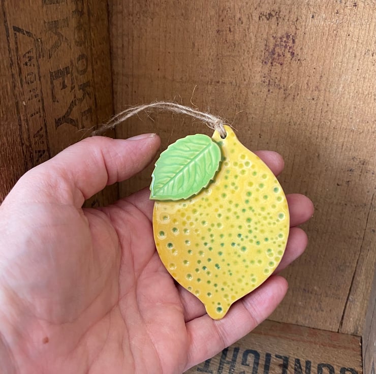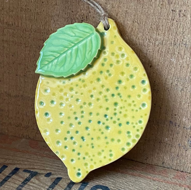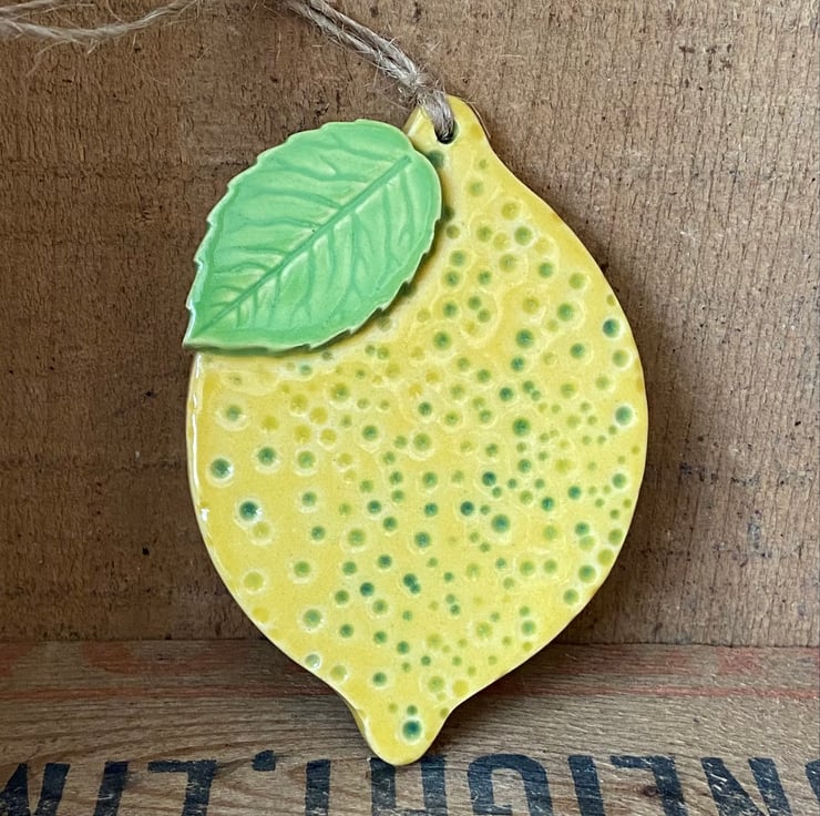 This lemon is hand cut from white earthenware clay, fired once, a rich glossy glaze is applied and it is then fired again - so is nice and strong. It measures 8cm x 6cm and hangs from a green string. It is glazed on the front and left plain on the back. Suitable for indoor or outdoor use.