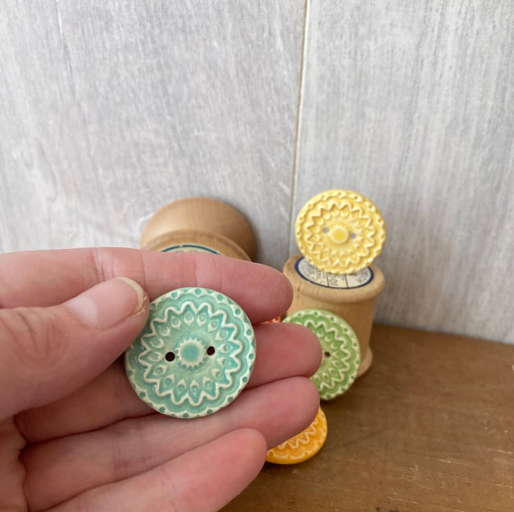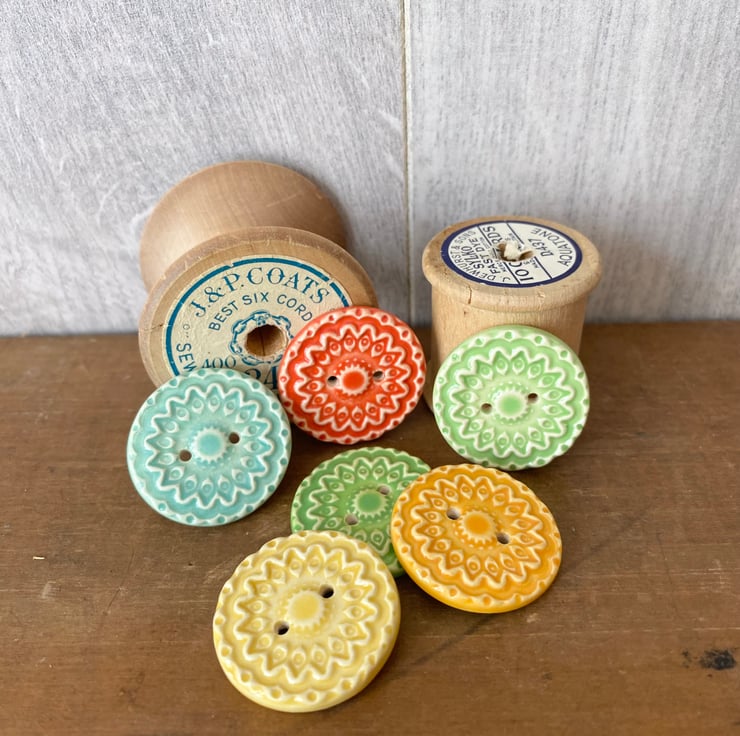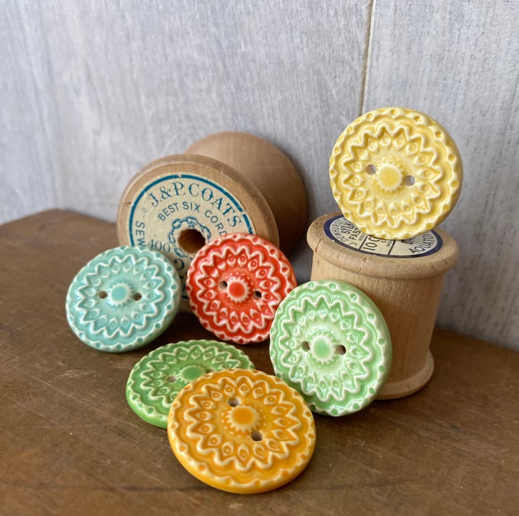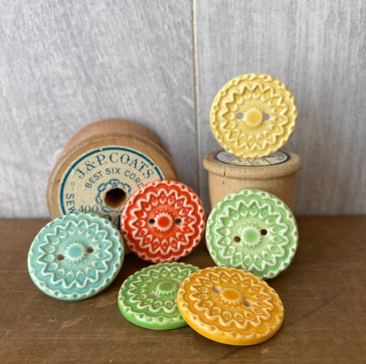 This set of six pottery buttons are made from white earthenware clay, embossed and glazed on the front. They are then fired to 1100 degrees, so nice and strong. They measure 2.8cm diameter. They can be handwashed or machine washed on a low temperature. Perfect for all sorts of arts and craft projects.