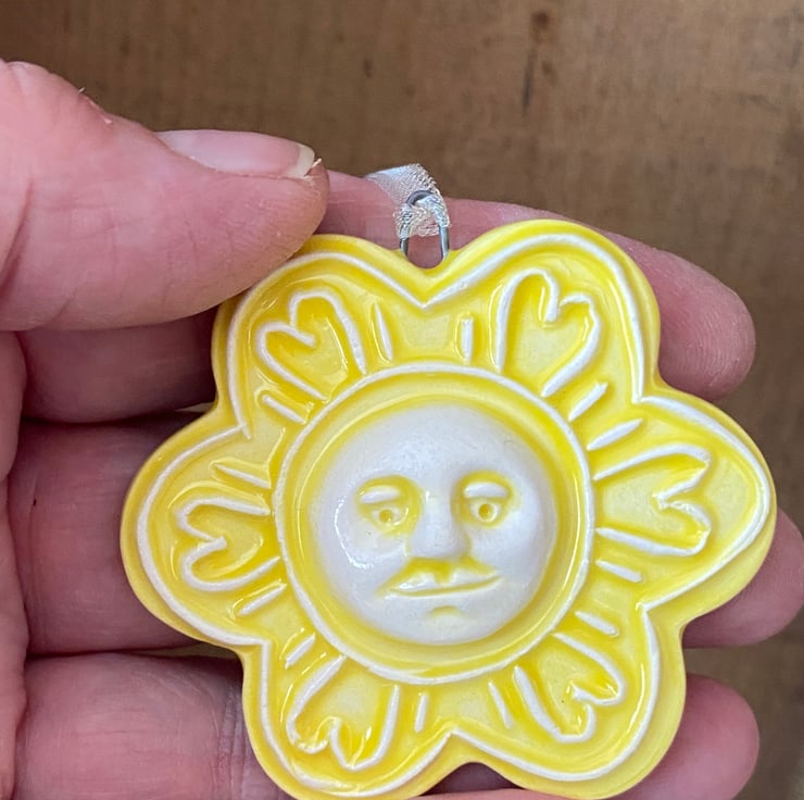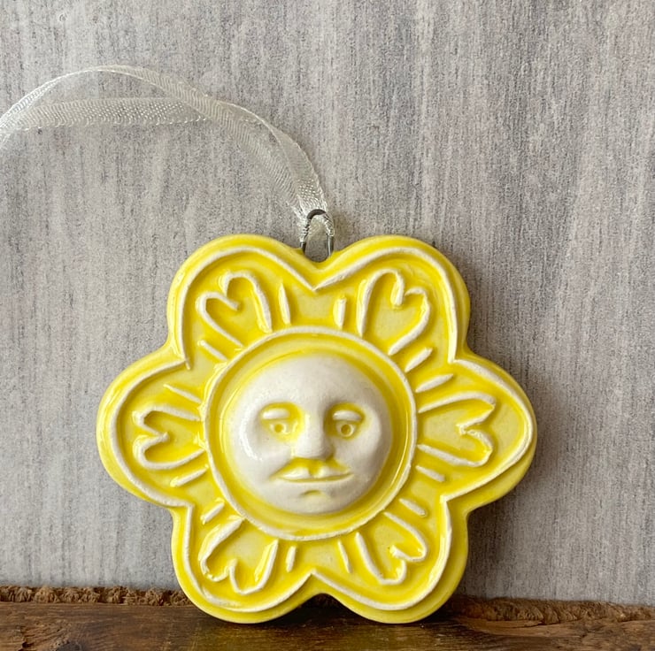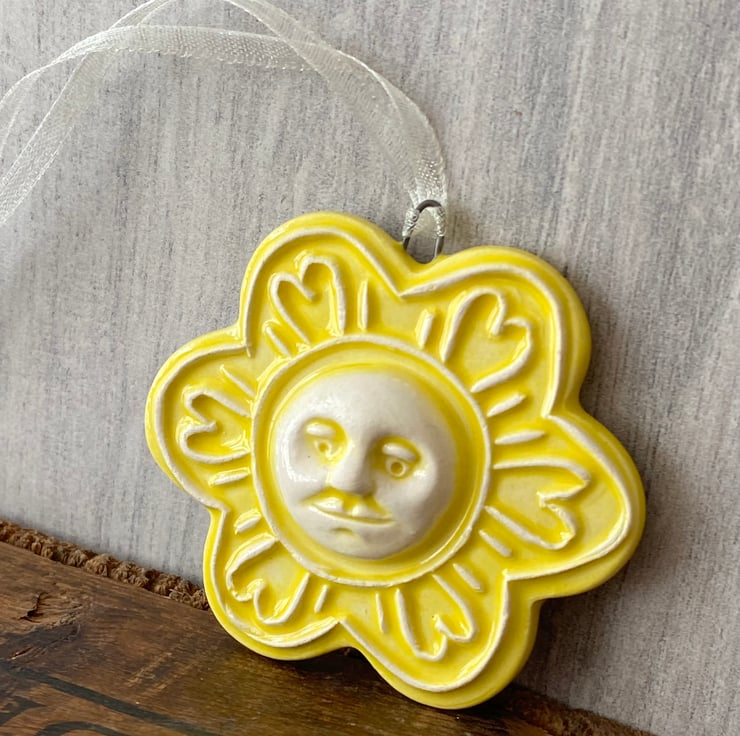 This unusual flower decoration is made from white earthenware clay and has a little moon face in the centre.It has been fired twice, once to the bisque stage and then a second firing for the glossy glaze. It measures 6 centimetres wide x 5cm height x 1cm thick and hangs from a cream organza ribbon.