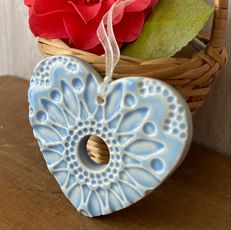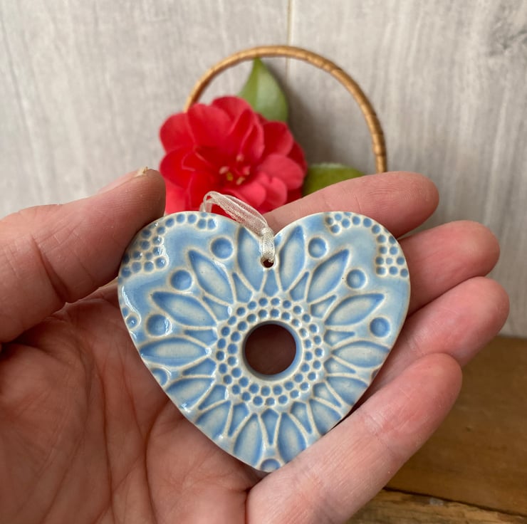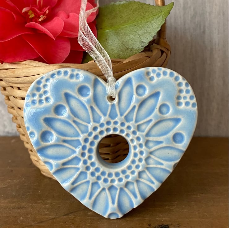 This little heart is made from white earthenware clay, imprinted with pattern and finished with a bright, glossy glaze. It has been fired twice, once to the bisque stage and then a second firing for the glaze. It measures 6 centimetres wide x 5.5cm height x 5mm thick. It can be hung outside.